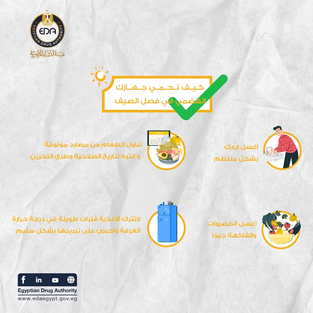 وأكدت هيئة الدواء أن ضرورة حماية الجهاز الهضمي في فصل الصيف من خلال اتباع الآتي: