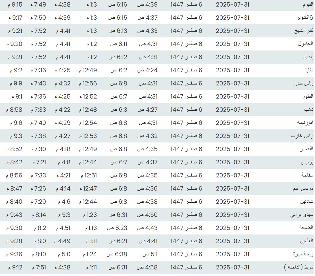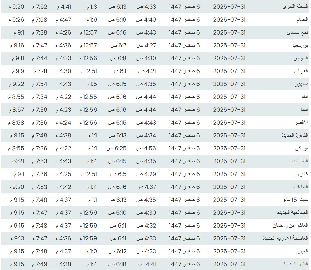 وفيما يلي مواقيت الصلاة، لعدد من مدن ومحافظات الجمهورية من واقع بيانات الهيئة العامة للمساحة