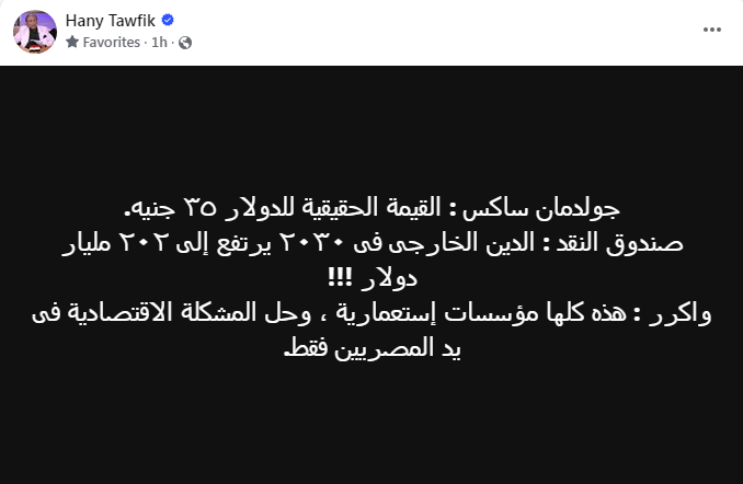 وقال هاني توفيق: "جولدمان ساكس: القيمة الحقيقية للدولار ٣٥ جنيه. صندوق النقد: الدين الخارجى فى ٢٠٣٠ يرتفع إلى ٢٠٢ مليار دولار!"