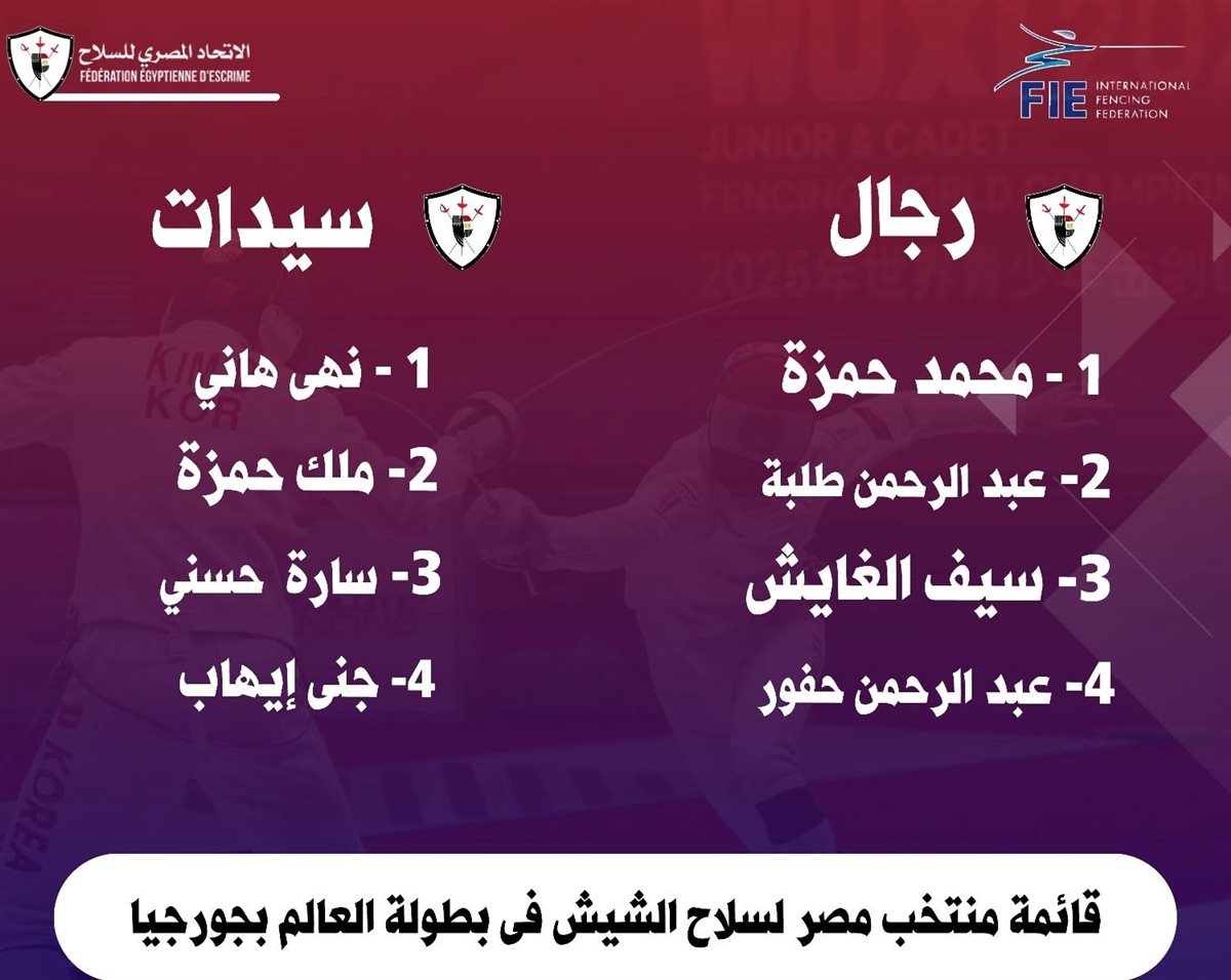 وكان اتحاد السلاح قد أعلن في وقت سابق قائمة منتخب سلاح السيف، المقرر مشاركته في بطولة العالم بجورجيا أيضا.