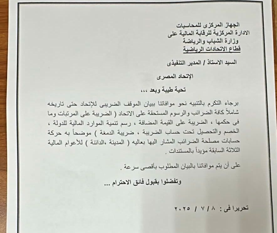 وفي تطور جديد، حصلت "فيتو" على خطاب صادر من أعلى الجهات المختصة في مصر، يطالب جميع الأندية الرياضية ببيان موقفها الضريبي بشكل تفصيلي، بما في ذلك كافة الضرائب والرسوم المستحقة عليها، مثل ضريبة المرتبات، ضريبة القيمة المضافة، رسم تنمية الموارد المالية للدولة، والضرائب الأخرى.