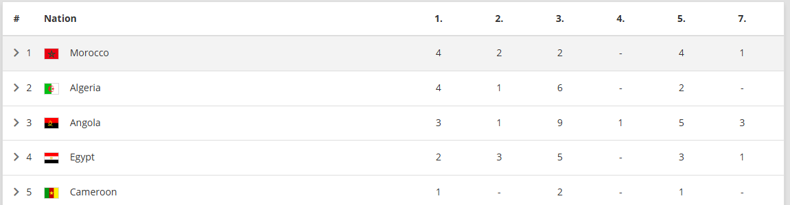 وحل منتخب المغرب في المركز الأول بـ4 ذهبيات يليه منتخب الجزائر في الوصافة ثم منتخب أنجولا في المركز الثالث.