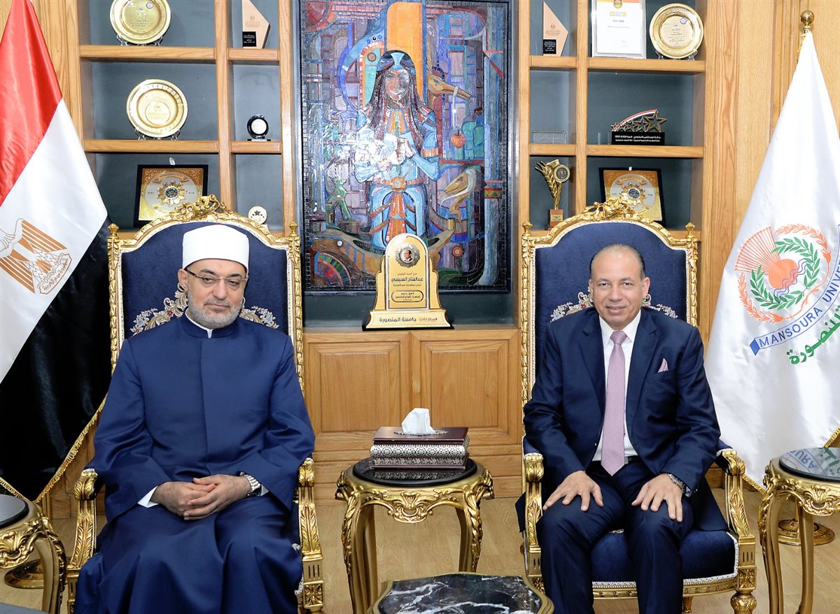 رئيس جامعة المنصورة يستقبل مفتي الجمهورية لبحث سبل التعاون المشترك وتعزيز الوعي الديني والفكري بين الشباب