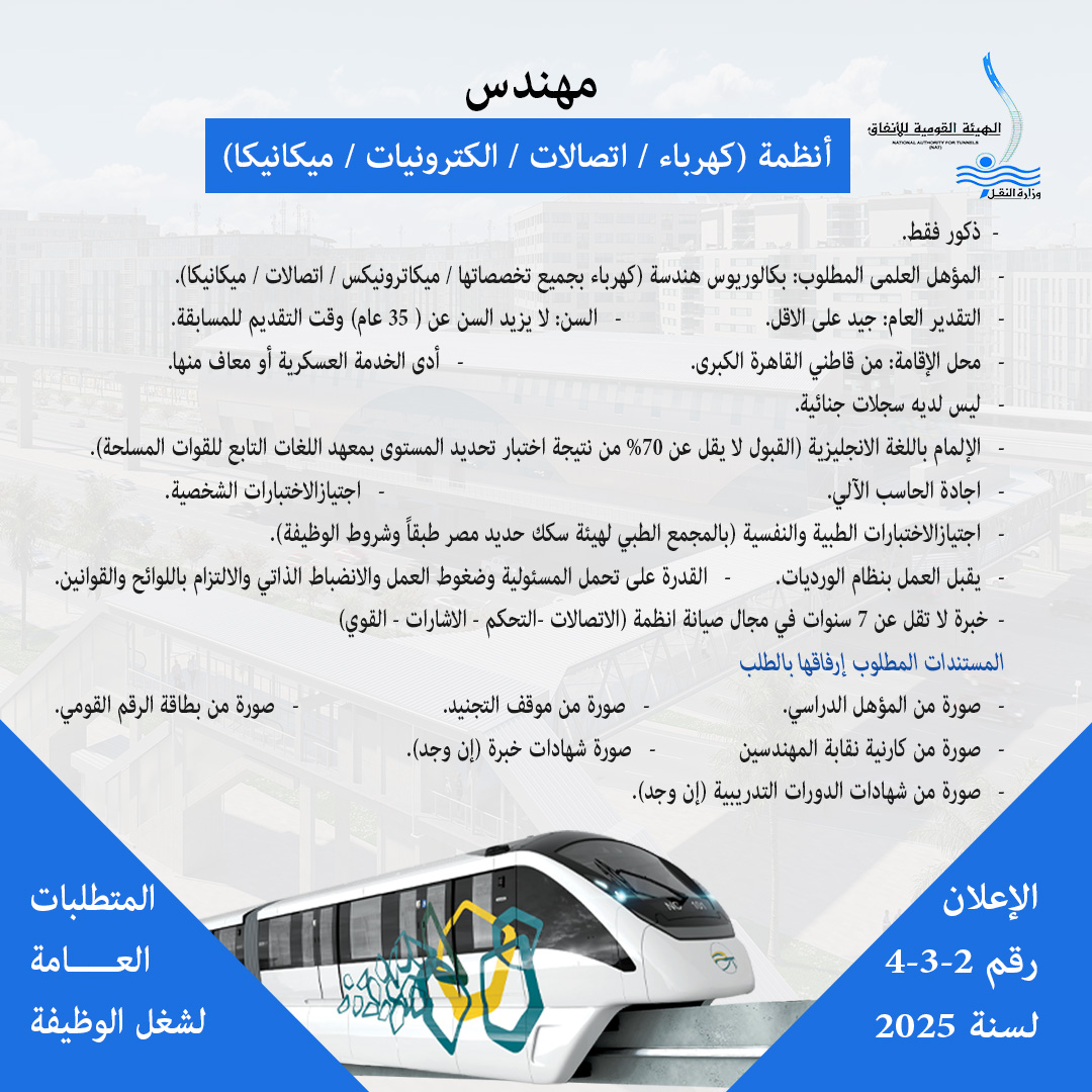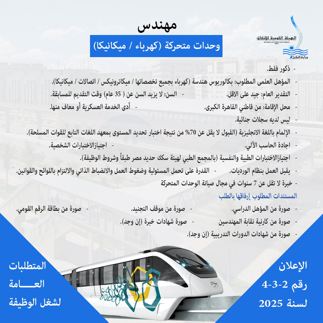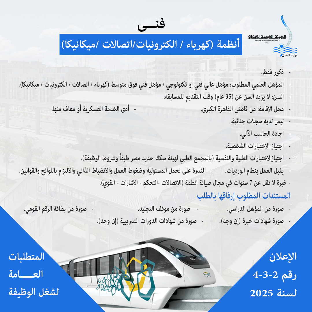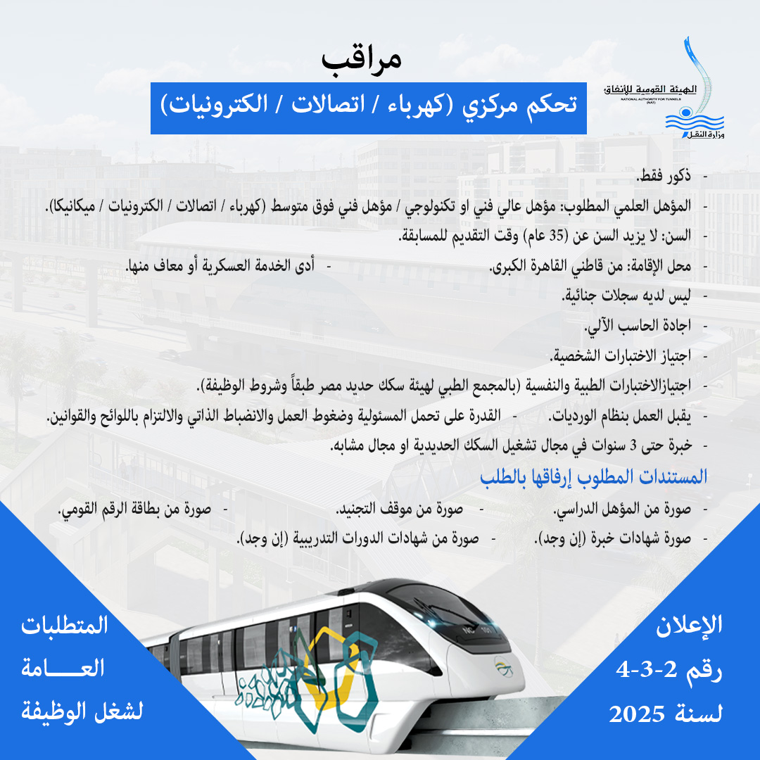 حيث أعلنت الشركة المصرية لتشغيل المترو عن توفر عددا من الوظائف في مشروع مونوريل القاهره الكبرى، وذلك تمهيدا للتشغيل الفعلي للمشروع خلال الفترة المقبلة.