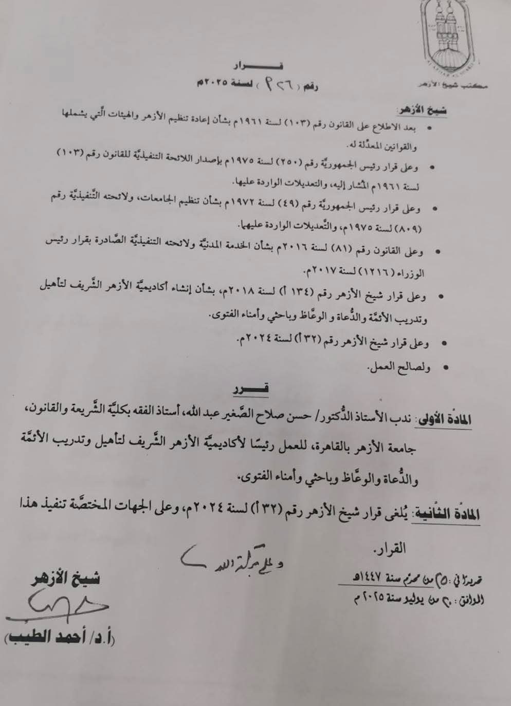 أصدر فضيلة الإمام الأكبر د/ أحمد الطيب، شيخ الأزهر الشريف، القرار رقم (٢٦ أ) لسنة ٢٠٢٥م، بتكليف د/ حسن صلاح الصغير، أستاذ الفقه بكلية الشريعة والقانون بالقاهرة - جامعة الأزهر، رئيسًا لأكاديمية الأزهر لتأهيل وتدريب الأئمة والدعاة والوعاظ وأمناء الفتوى.