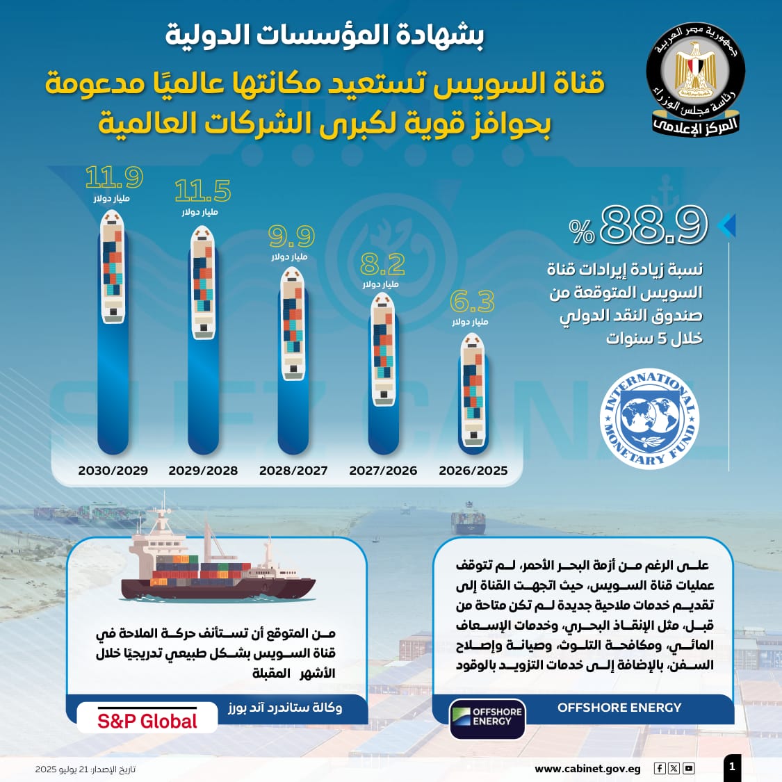 وسلطت الإنفوجرافات الضوء على الرؤية الإيجابية للمؤسسات الدولية بشأن أداء قناة السويس، حيث توقع صندوق النقد الدولي زيادة إيرادات قناة السويس خلال 5 سنوات بنسبة 88.9%، لتصل إلى 11.9 مليار دولار عام 2029/2030، مقارنة بإيرادات متوقعة 6.3 مليار دولار خلال عام 2025/2026، ومن المتوقع أن ترتفع إلى 8.2 مليار دولار عام 2026/2027، و9.9 مليار دولار عام 2027/2028، و11.5 مليار دولار عام 2028/2029.