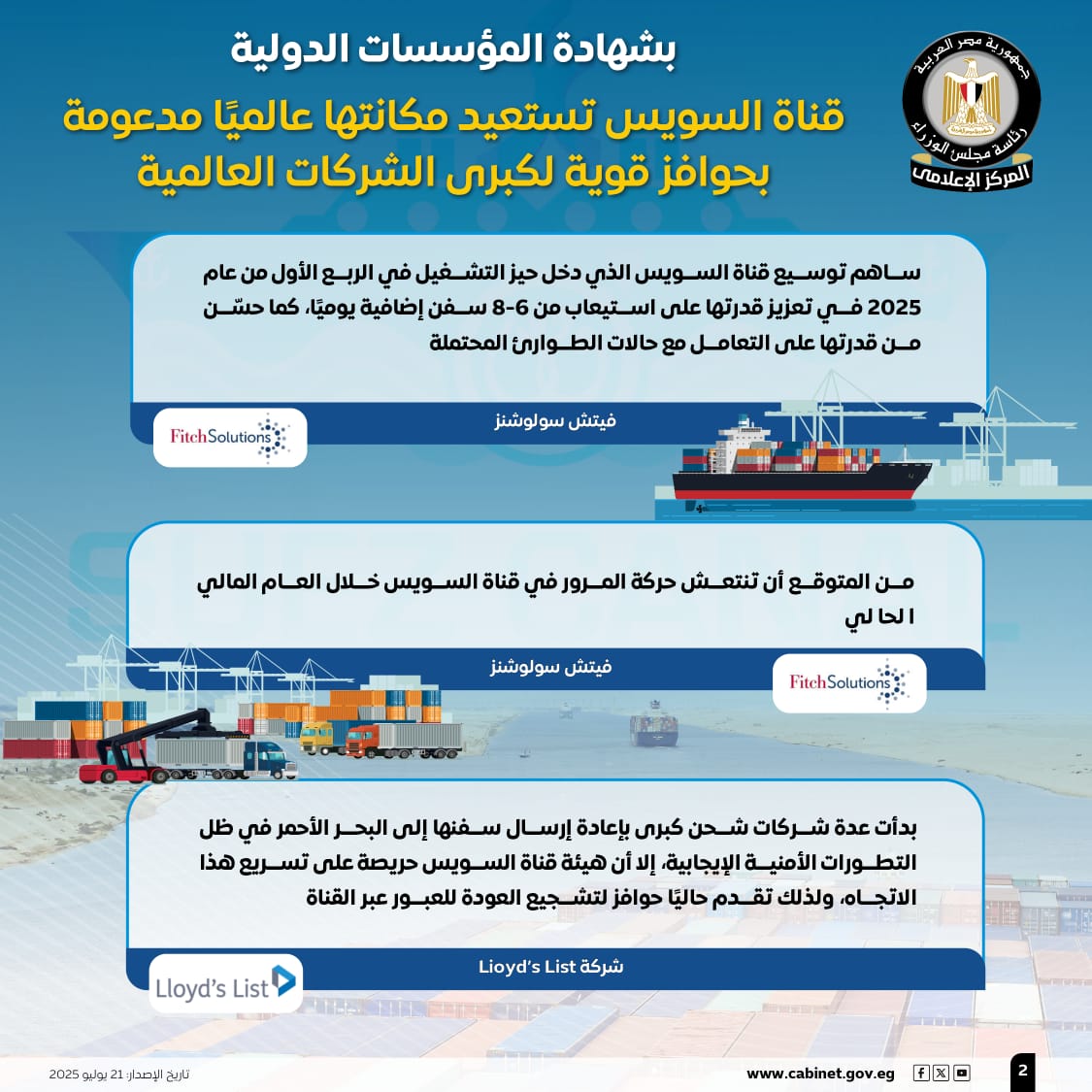 نشر المركز الإعلامي لمجلس الوزراء عددًا من الإنفوجرافات عبر منصاته على مواقع التواصل الاجتماعي، سلط من خلالها الضوء على استعادة قناة السويس مكانتها عالميًا مدعومة بحوافز قوية لكبرى الشركات العالمية، وذلك بشهادة المؤسسات الدولية.