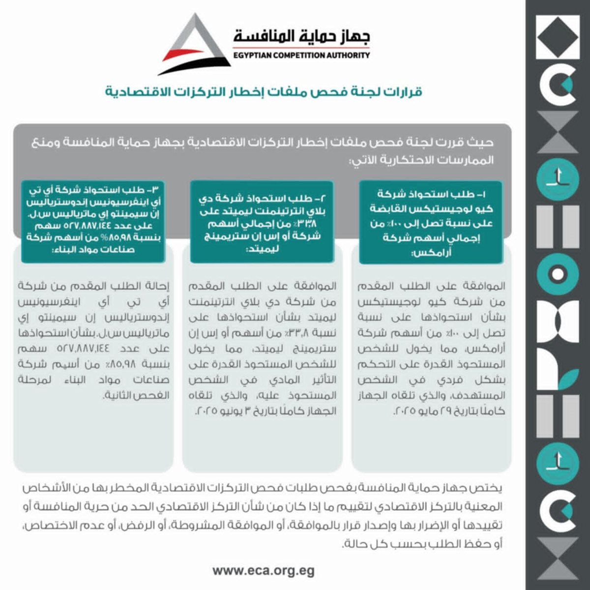 أعلنت لجنة فحص ملفات إخطار التركزات الاقتصادية بـجهاز حماية المنافسة ومنع الممارسات الاحتكارية الموافقة على طلب التركز الاقتصادي الخاص بطلب استحواذ شركة “سي إم إيه سي جي إم إنلاند سرفيسيز” على نسبة 35% من أسهم ميناء أكتوبر الجاف.