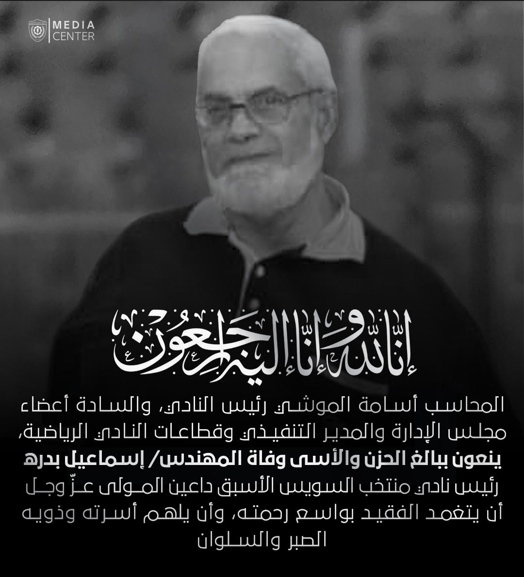وقدم نادي منتخب السويس برئاسة المحاسب أسامة الموشي رئيس النادي، وأعضاء مجلس الإدارة والمدير التنفيذي، وقطاعات النادي الرياضية، العزاء في وفاة المهندس إسماعيل بدرة، رئيس نادي منتخب السويس الأسبق ورمز من رموز كرة القدم بمحافظة السويس.