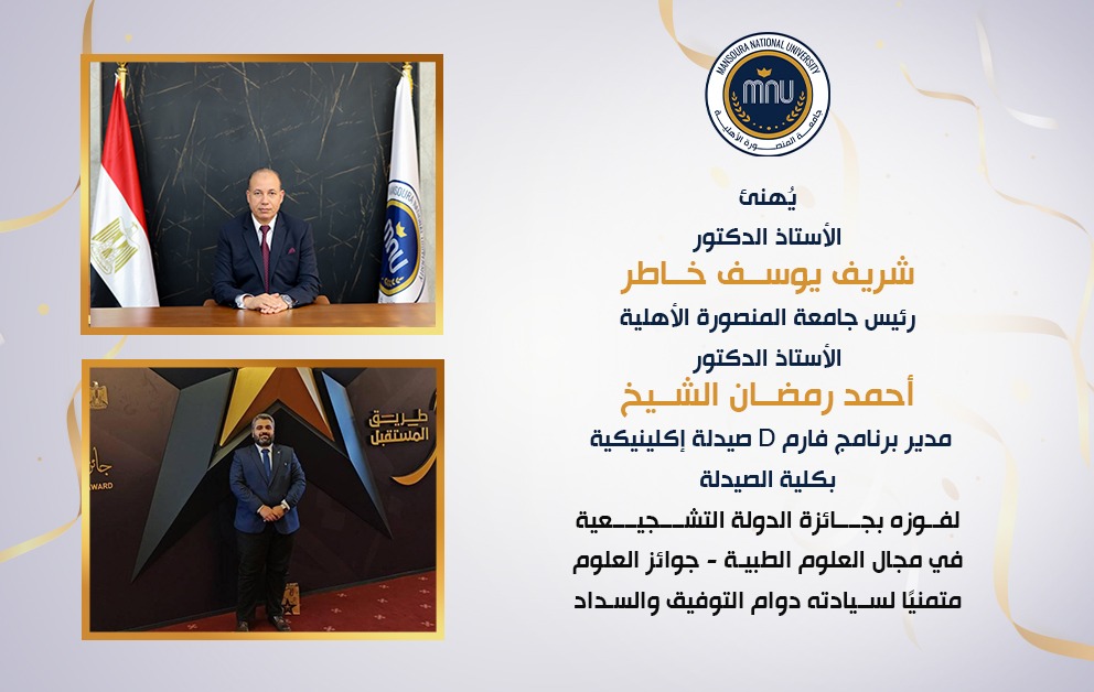 هنأ الدكتور شريف يوسف خاطر، رئيس جامعة المنصورة الأهلية، الدكتور أحمد رمضان الشيخ، مدير برنامج فارم D (صيدلة إكلينيكية) بكلية الصيدلة – جامعة المنصورة الأهلية، بمناسبة فوزه بجائزة الدولة التشجيعية في مجال العلوم الطبية، إحدى أرفع الجوائز العلمية التي تُمنح سنويًا لتكريم العلماء والباحثين المتميزين في مختلف التخصصات العلمية.