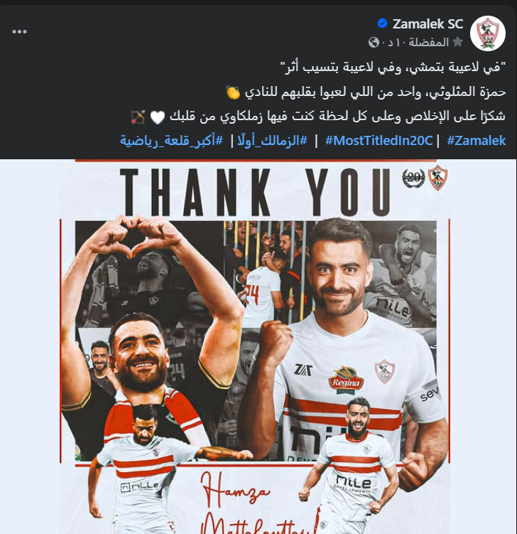 ونشر حساب الزمالك عبر صفحته الرسمية على فيس بوك:"فيه لعيبة بتمشي، وفيه لعيبة بتسيب أثر،