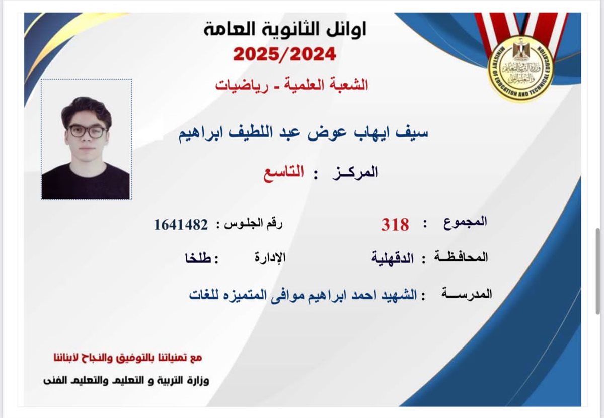 حيث حصد سيف إيهاب عوض عبد اللطيف المقيد بمدرسة الشهيد أحمد إبراهيم موافي المتميزة للغات إدارة طلخا التعليمية، المركز التاسع علمي رياضة بمجموع 318