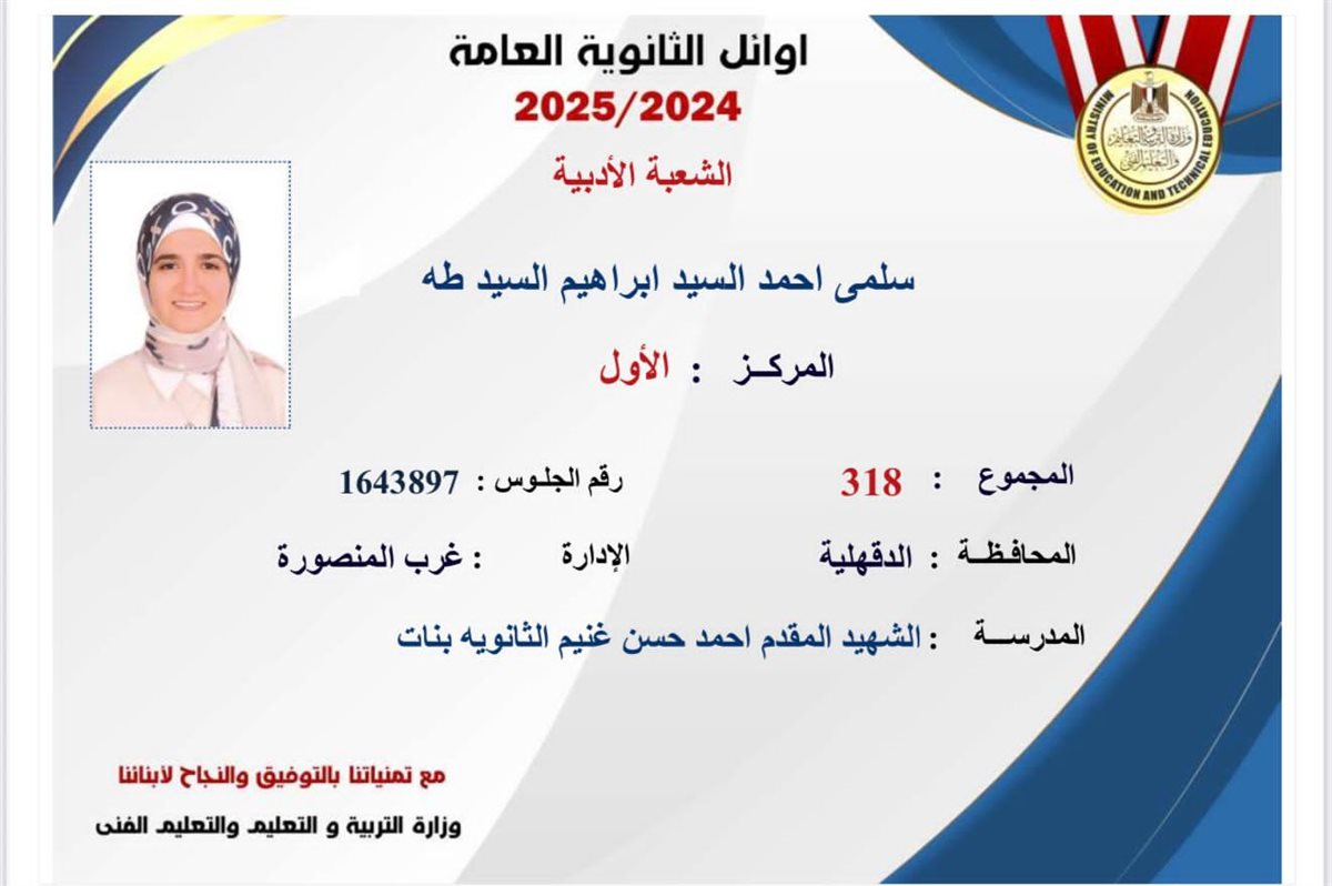 وفي الشعبة الأدبية حصدت سلمي أحمد السيد إبراهيم المركز الأول والمقيدة بمدرسة الشهيد المقدم أحمد حسن غنيم الثانوية بنات التابعة لإدارة غرب المنصورة الأولى بمجموع 318