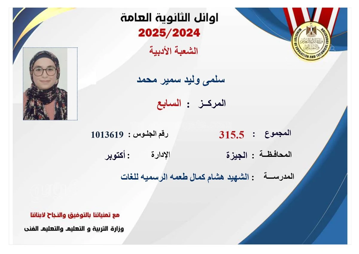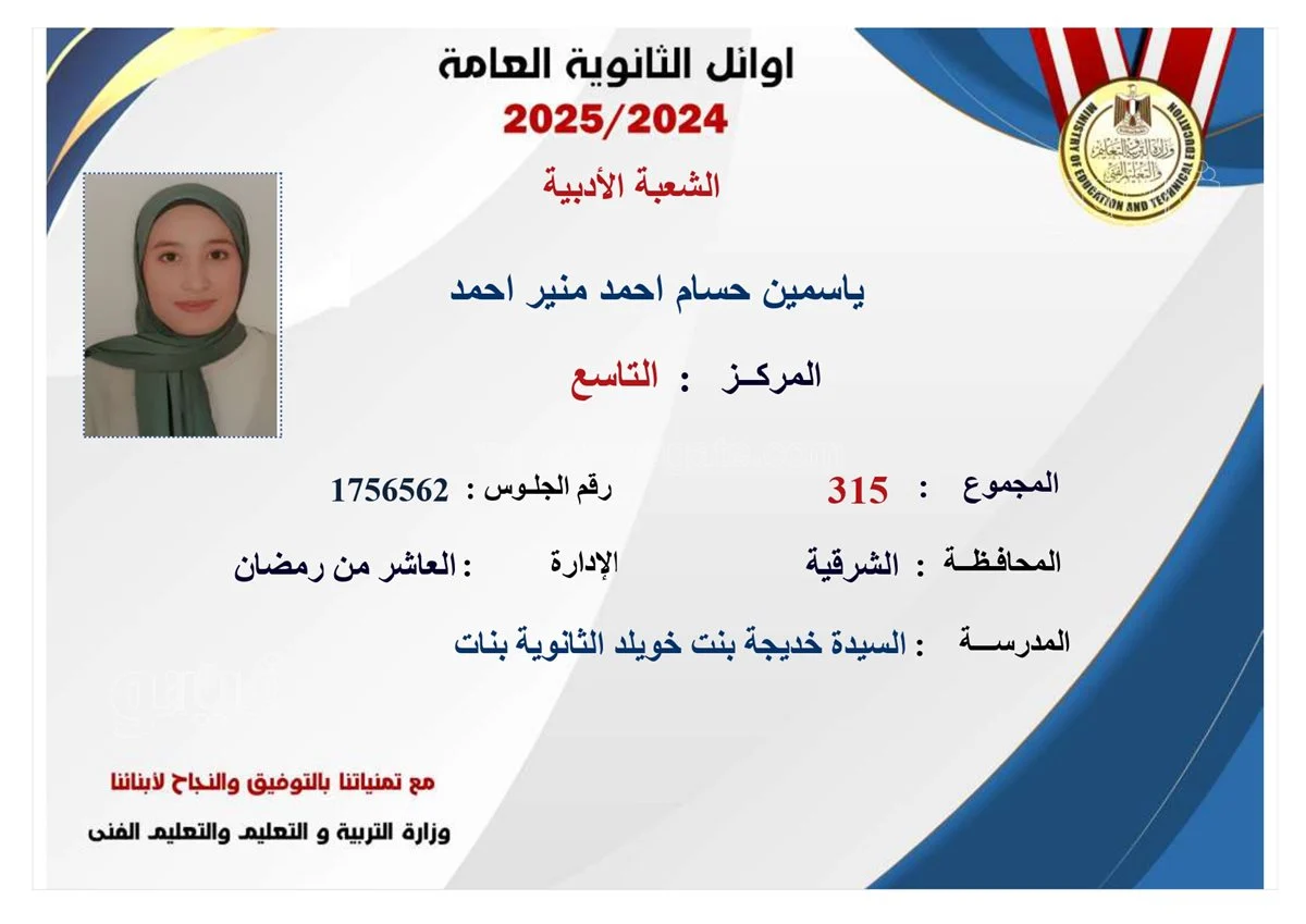 نتيجة الثانوية العامة 2025، قائمة أوائل الثانوية العامة شعبة أدبي