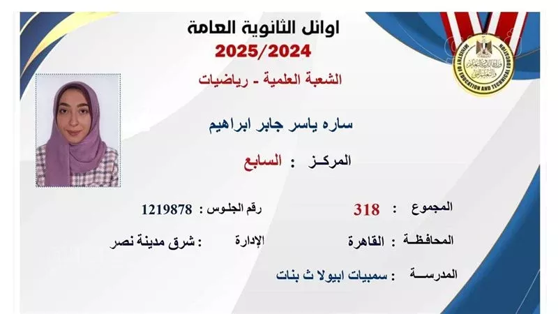 نتيجة الثانوية العامة 2025، قالت سارة ياسر الحاصلة على المركز السابع في الثانوية العامة شعبة علمي رياضة: «لم أتوقع أي شيء، واتصل بي خالي، بعدما رأى صورتي منشورة بأحد المواقع الصحفية لأنني من الأوائل، لم أصدق ذلك، وبكيت فرحًا، وكنا سعداء جميعًا، فلم أتوقع أن أكون من الأوائل، وكنت أعتقد أنني سأنقص الكثير من الدرجات، والامتحانات كانت صعبة، ولم يكن طموحي كبيرًا، إلا أنني كنت أريد الالتحاق بكلية الهندسة».