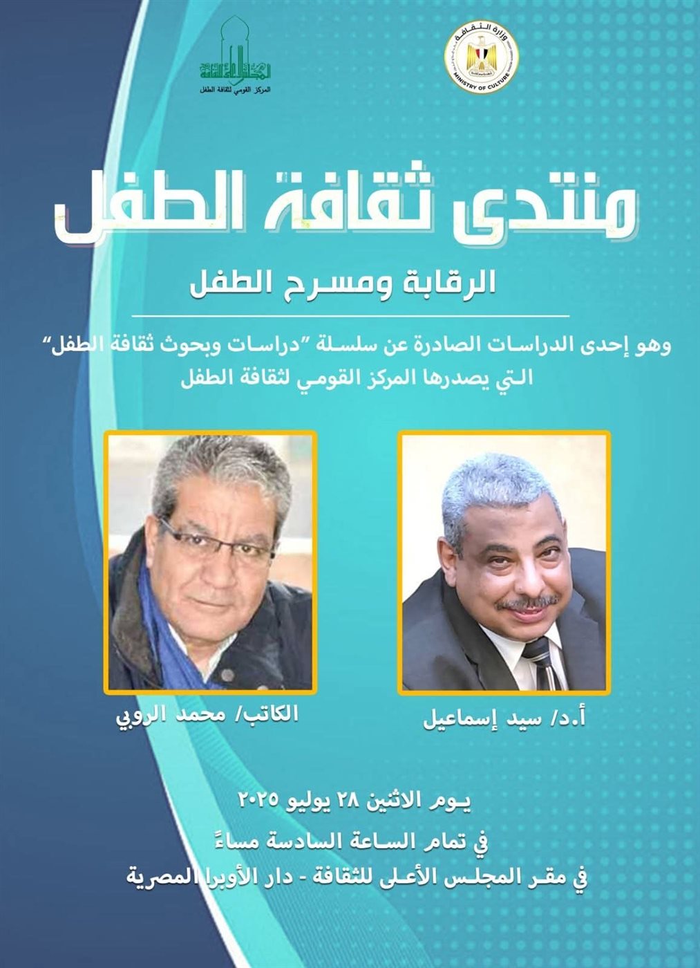 ويستضيف المنتدى د. سيد علي إسماعيل والذي أعد الدراسة، ويناقشه الكاتب محمد الروبي ويدير اللقاء الباحث أحمد عبد العليم في حضور العديد من الباحثين والدارسين والمهتمين بشئون الطفل.