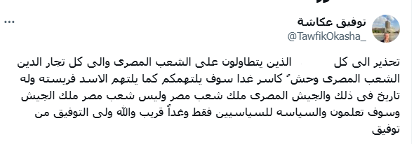 وقال توفيق عكاشة في تحذيره لكل من يتطاولون على الشعب المصري: “تحذير إلى كل... الذين يتطاولون على الشعب المصرى وإلى كل تجار الدين الشعب، المصرى وحشً كاسر غدًا سوف يلتهمكم كما يلتهم الأسد فريسته، وله تاريخ فى ذلك، والجيش المصرى ملك شعب مصر... وسوف تعلمون والسياسة للسياسيين فقط وغدًا قريب والله ولي التوفيق من توفيق”.