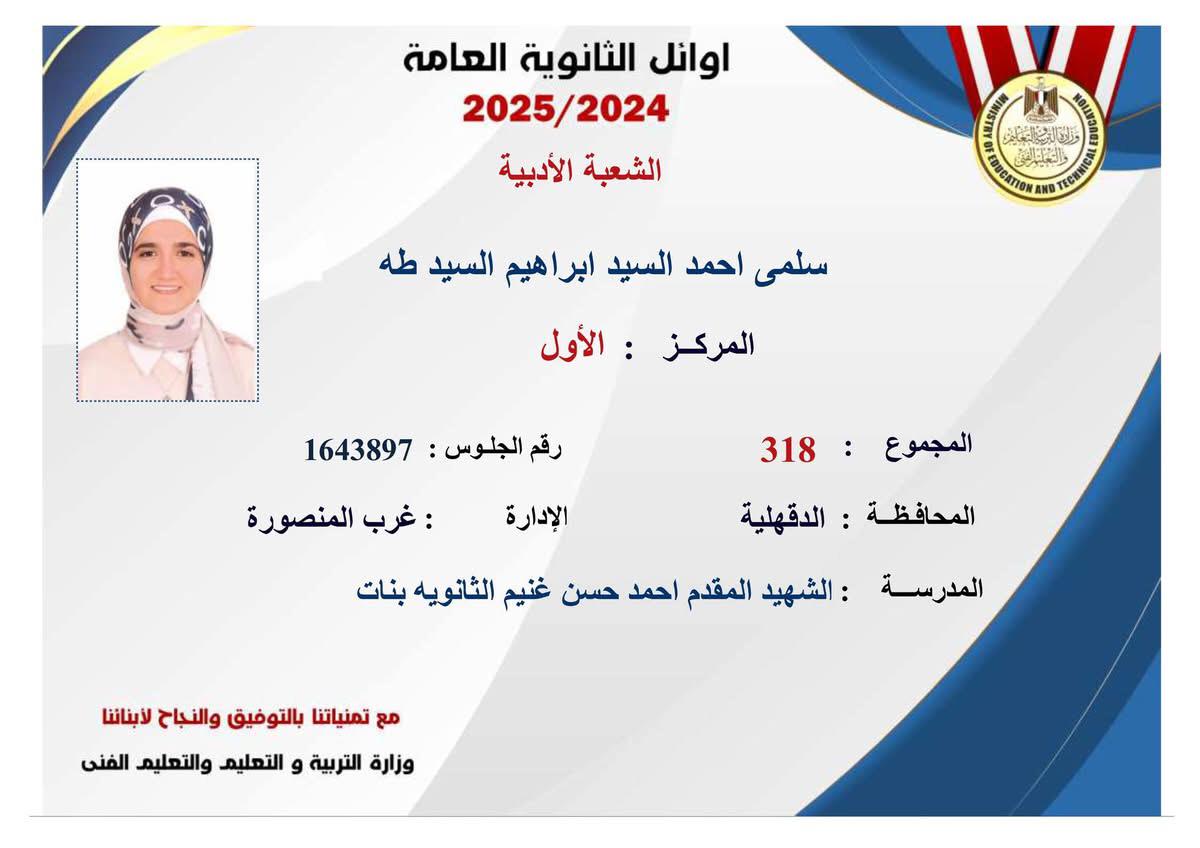 حصلت الطالبة سلمى أحمد السيد ابراهيم السيد طه، على المركز الأول بالشعبة الأدبية على مستوى الجمهورية، من مدرسة الشهيد المقدم أحمد حسن غنيم الثانوية بنات بإدارة غرب المنصورة التعليمية، والطالب سيف إيهاب عوض عبد اللطيف الحاصل على المركز التاسع بالشعبة العلمية رياضيات على مستوى الجمهورية، من مدرسة الشهيد أحمد ابراهيم موافي المتميزة للغات بإدارة طلخا التعليمية.