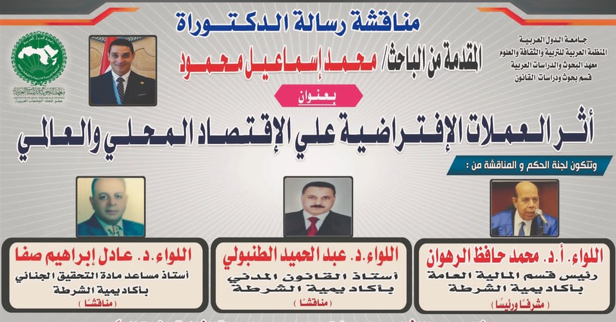 شهد معهد البحوث والدراسات العربية بالقاهرة، أحد أهم المراكز التابعة للمنظمة العربية للتربية والثقافة والعلوم، مناقشة رسالة دكتوراه في القانون العام للمستشار محمد إسماعيل محمود بعنوان "أثر العملات الافتراضية على الاقتصاد المحلي والعالمي".