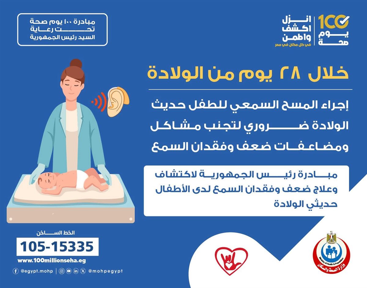 كشفت وزارة الصحة عن الموعد المناسب لإجراء المسح السمعي لحديثي الولادة لتجنب مشاكل ومضاعفات ضعف وفقدان السمع وهو خلال ٢٨ يومًا من الولادة مشيرة إلى أنه لا يمكن إجراء هذا الفحص بعد مرور 28 يومًا من الولادة.