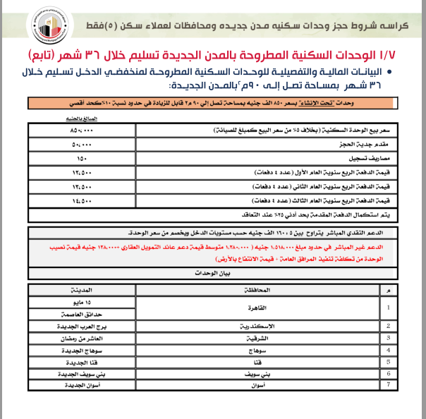 ويمكنهم التقدم لحجز عدد 34128 وحدة سكنية بالمدن الجديدة، وهي وحدات تحت الإنشاء تسليم خلال 36 شهرًا بمدن: أسوان الجديدة، بني سويف الجديدة، حدائق العاصمة، برج العرب الجديدة، العاشر من رمضان، 15 مايو، سوهاج الجديدة، قنا الجديدة، بالإضافة إلى 690 وحدة سكنية (جاهزة للتسليم) بمدينة أخميم الجديدة.