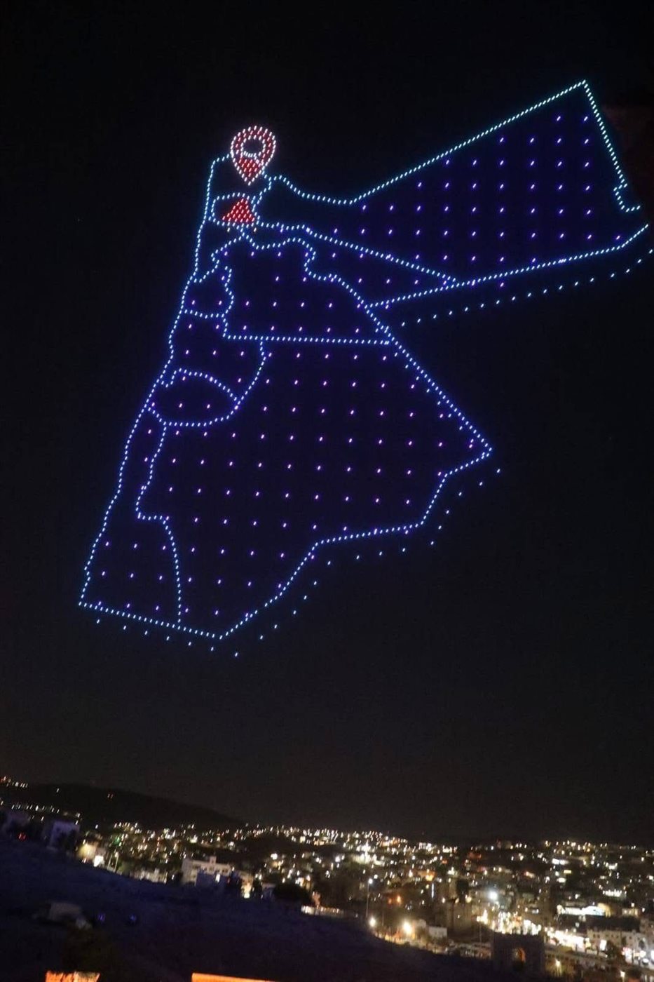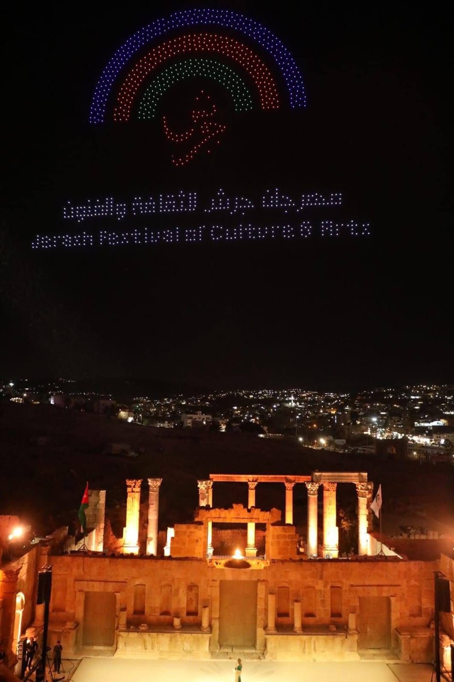وشهد حفل الافتتاح عروضًا استعراضية بالطائرات (الدرون)، حيث أضاءت سماء جرش لوحات ضوئية جسّدت صور جلالة الملك وولي العهد، وشعار المهرجان، إلى جانب مشاهد فنية رقمية تعكس جمال وعراقة المسارح الأثرية في المدينة الأردنية العريقة.