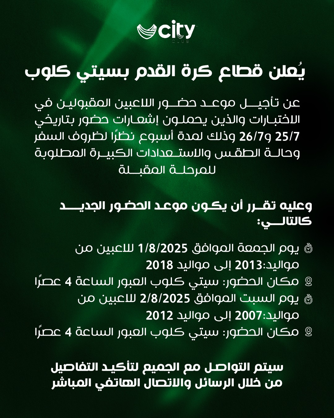 اختبارات الناشئين، قرر قطاع كرة القدم بنادي سيتي كلوب بقيادة الكابتن محمد وهبة عضو مجلس الإدارة تأجيل موعد حضور اللاعبين المقبولين في اختبارات كرة القدم والذين يحملون إشعارات حضور بتاريخي 25/7 و26/7 وذلك لمدة أسبوع.