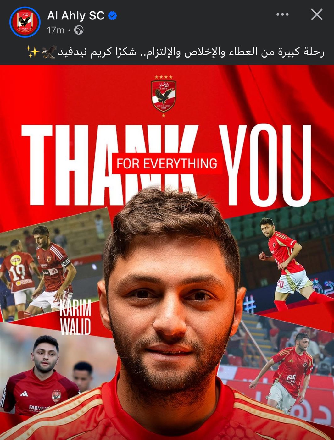وجه الحساب الرسمي للنادي الأهلي على موقع التواصل الاجتماعي فيسبوك رسالة لـ كريم نيدفيد لاعب الفريق السابق بعد انتقاله مؤخرا لصفوف سيراميكا كليوباترا خلال الانتقالات الجارية.
