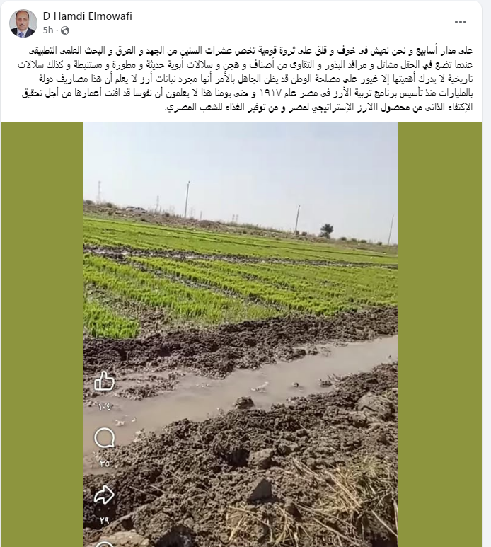 وأضاف الدكتور حمدي الموافي: "ما المطلوب منى وهذه أرض حق انتفاع للمشروع القومي لتطوير إنتاج الأرز الهجين، والأرز السوبر، والبسمتى، وحقول إكثار؛ نصرف الملايين من أجل مستقبل أفضل لوطننا الحبيب وإطعام الشعب، ليسرق الجهلاء والبلطجية جهود البحث العلمي بملاليم، نداء إلى كل من يستطيع حمايتنا لا قبل لنا بهؤلاء ليست وظيفتي".