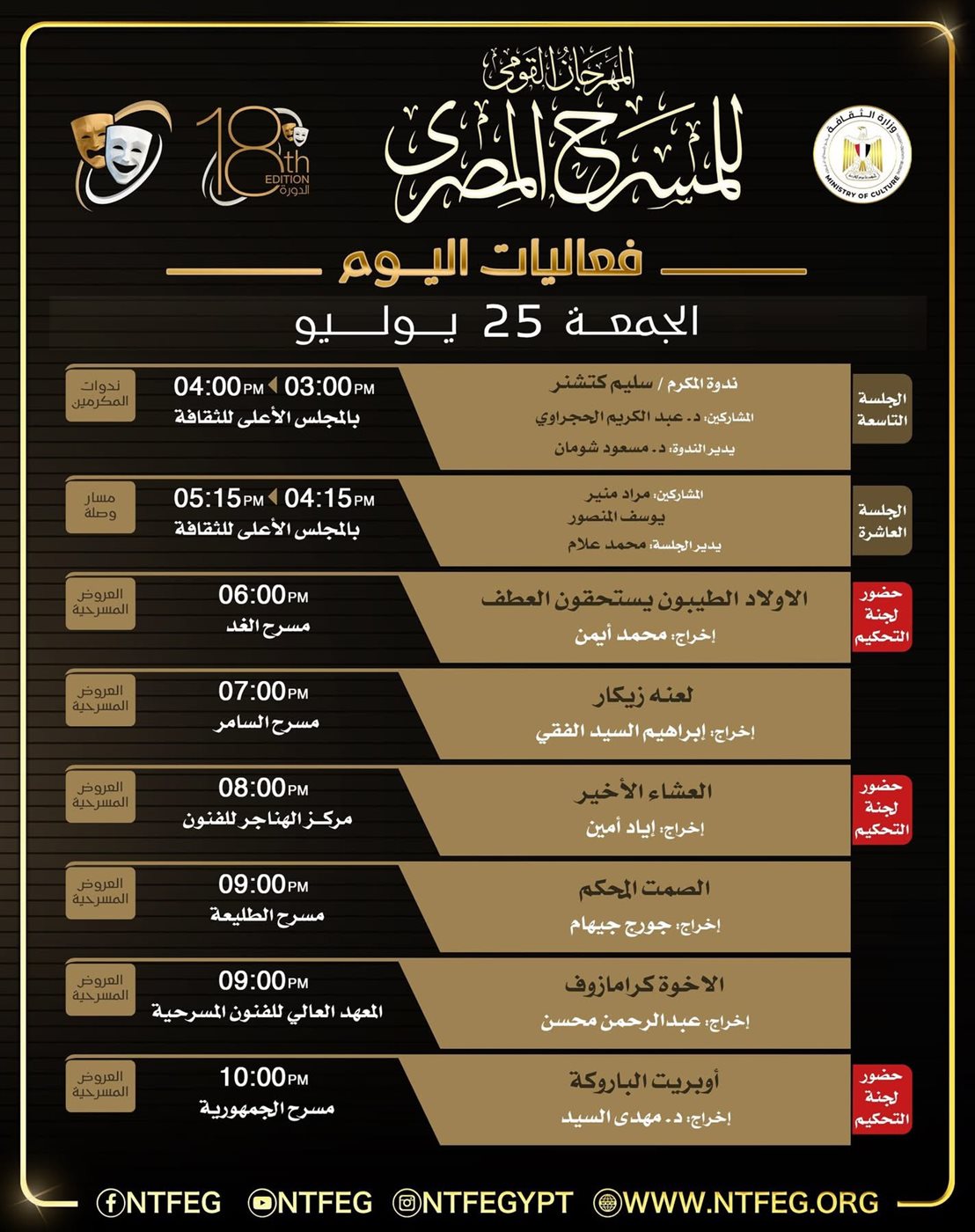 ينظم المهرجان القومي للمسرح المصري في دورته الثامنة عشرة برئاسة الفنان محمد رياض، اليوم الجمعة، العديد من الفعاليات والعروض المسرحية ضمن برنامج دورة هذا العام.