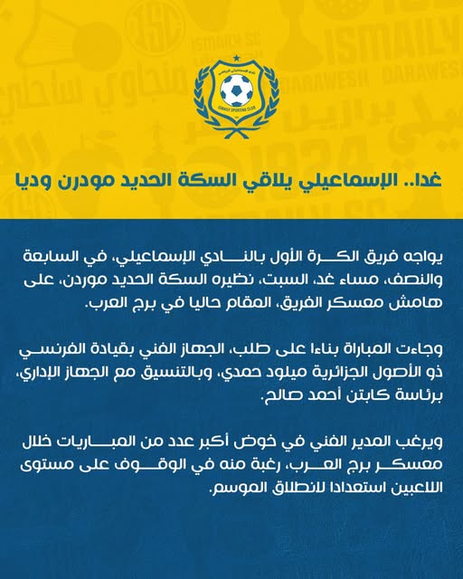 يواجه الفريق الأول لكرة القدم بالنادي الإسماعيلي، مساء غد السبت نظيره السكة الحديد مودرن، وديا في تمام الساعة السابعة والنصف، ضمن معسكر إعداد الدراويش المقام حاليا في برج العرب، وذلك قبل بداية الموسم الجديد 2025-2026.
