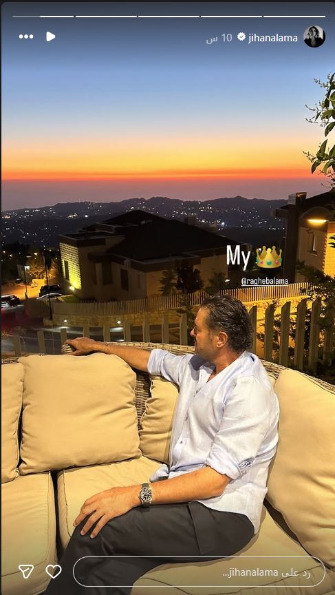 نشرت زوجة راغب علامة صورة له عبر خاصية "الإستوري" على حسابها الرسمي في تطبيق "إنستجرام"، وعلقت عليها بكلمة واحدة فقط هي "مَلِكي".