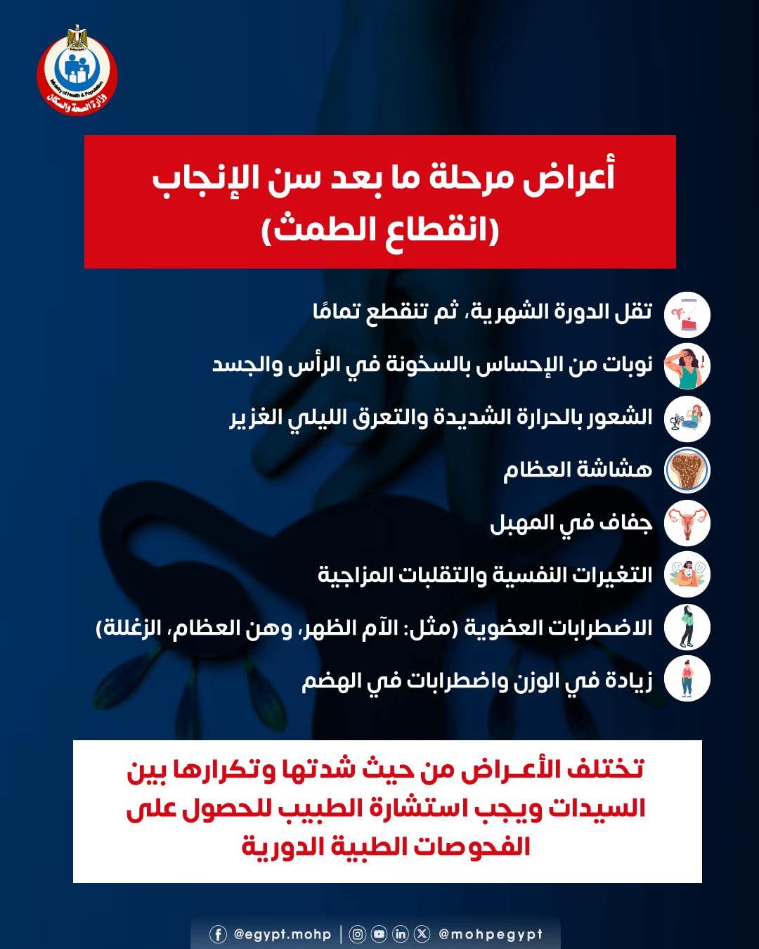 وطالبت وزارة الصحة جميع السيدات في هذه المرحلة بضرورة الاهتمام بالتغذية السليمة، وممارسة الرياضة، والمتابعة الدورية مع أطباء النساء والعظام والنفسية.
