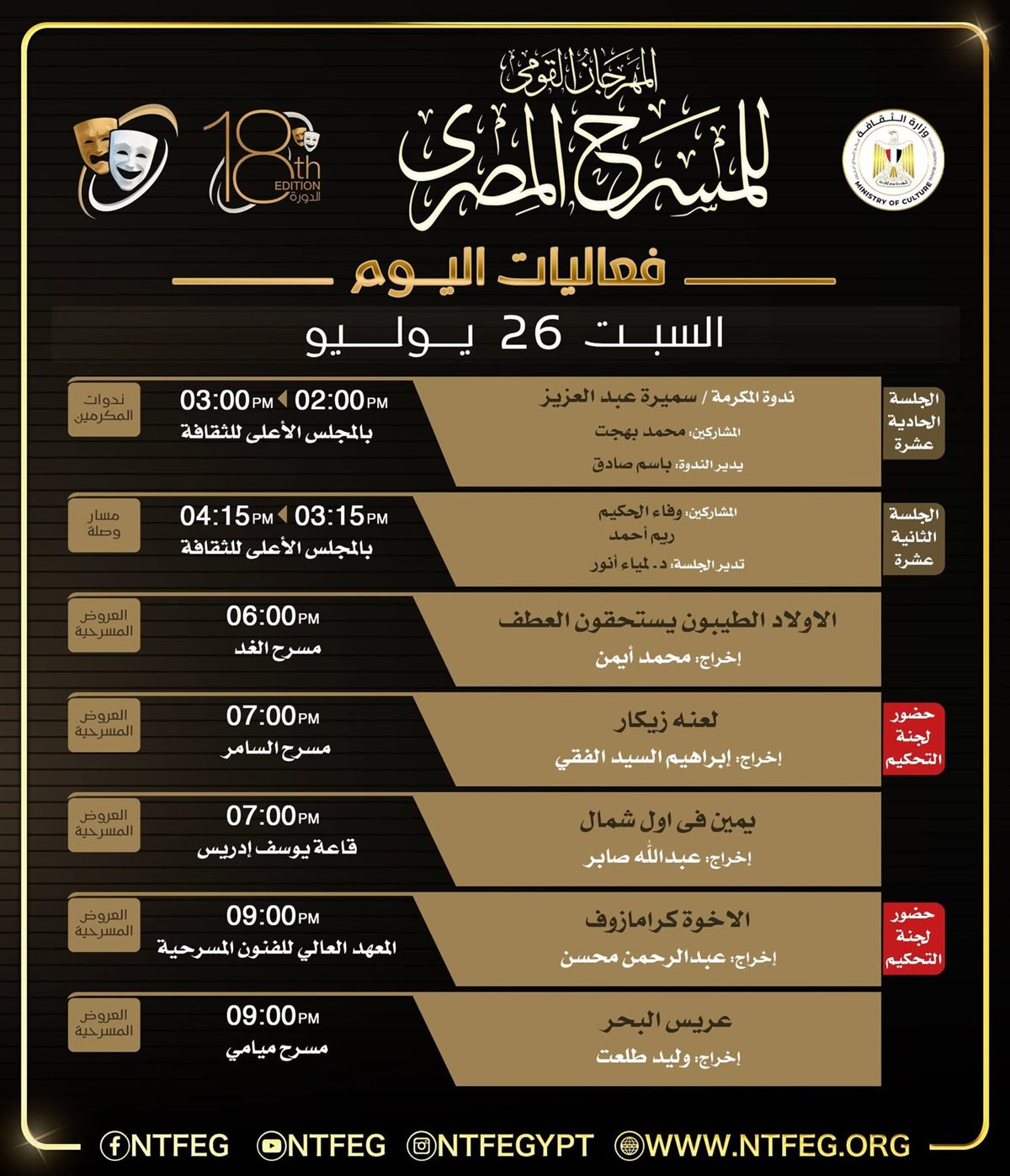 ينظم المهرجان القومي للمسرح المصري في دورته الثامنة عشرة برئاسة الفنان محمد رياض، اليوم السبت 26 يوليو الجاري، العديد من الفعاليات والعروض المسرحية ضمن برنامج دورة هذا العام.