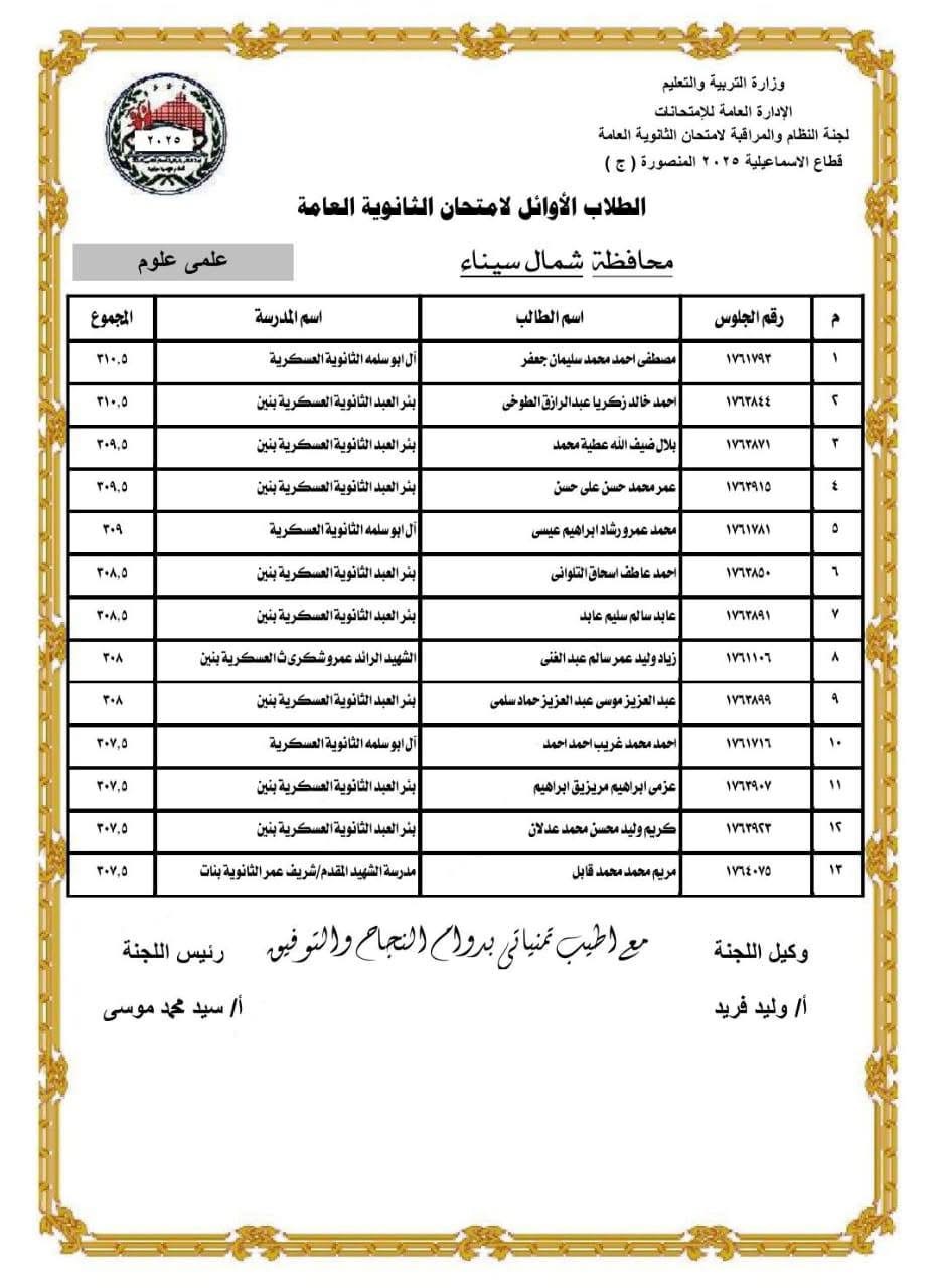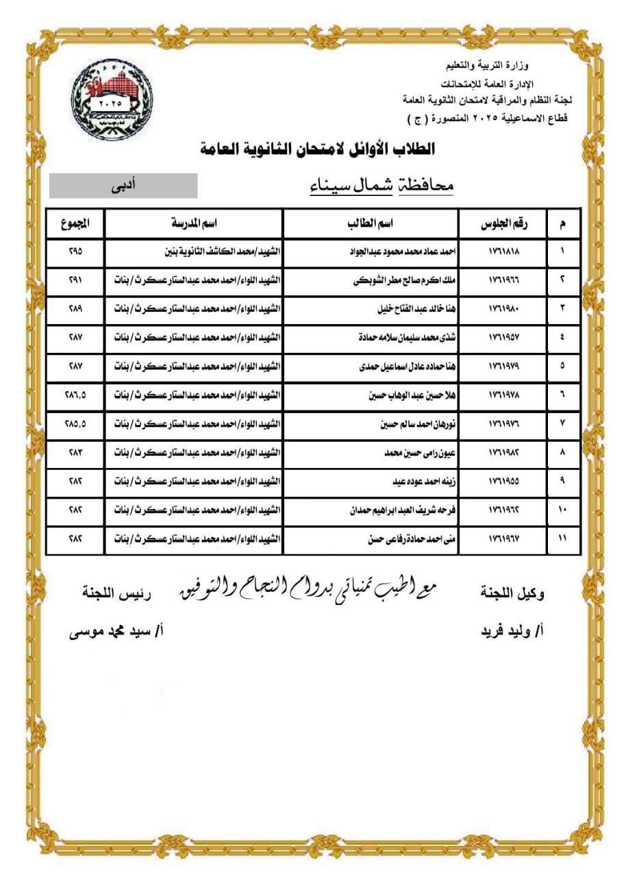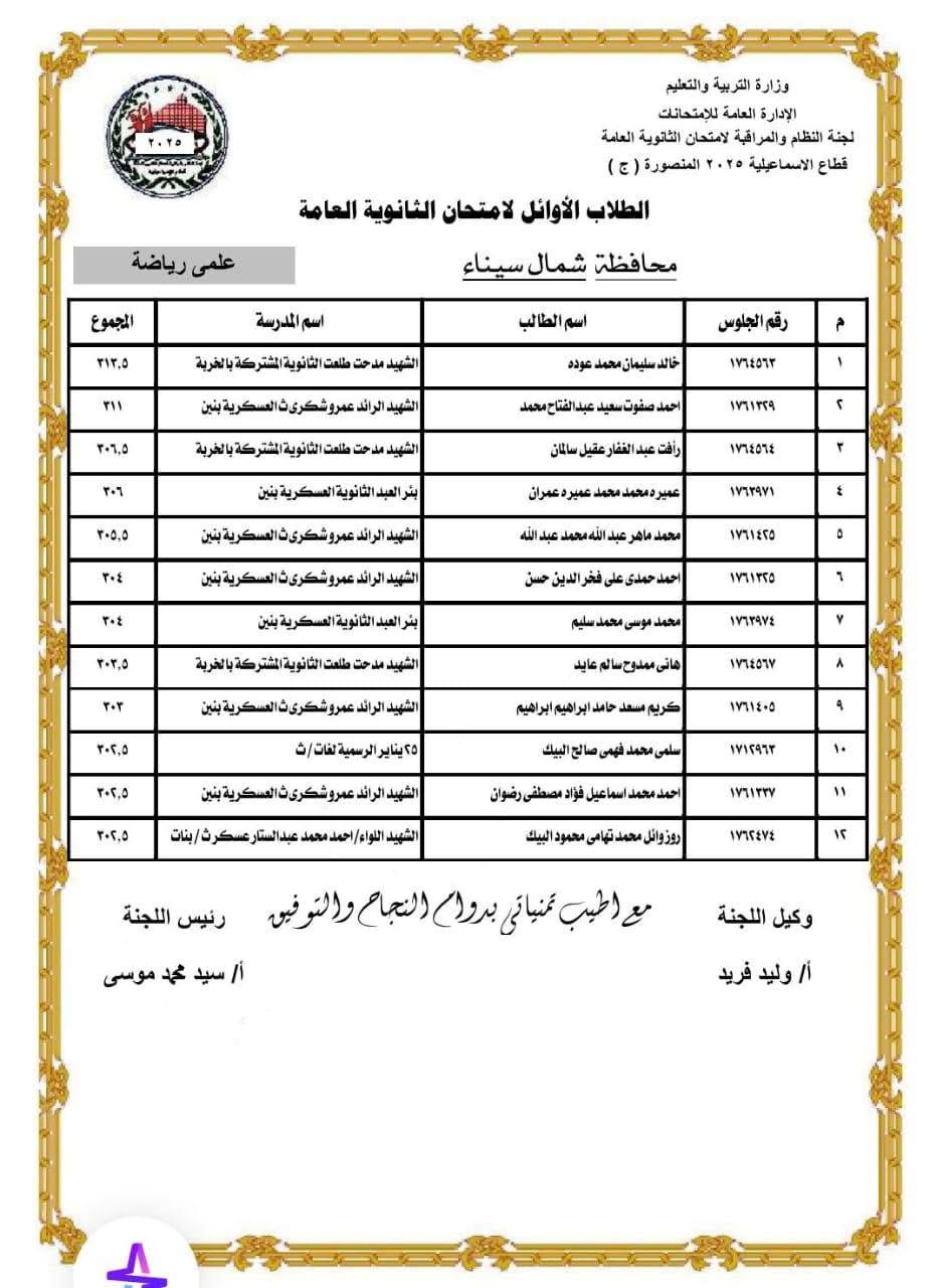 تعليم شمال سيناء تعلن أسماء أوائل الثانوية العامة والمحافظ يوجه التهنئة