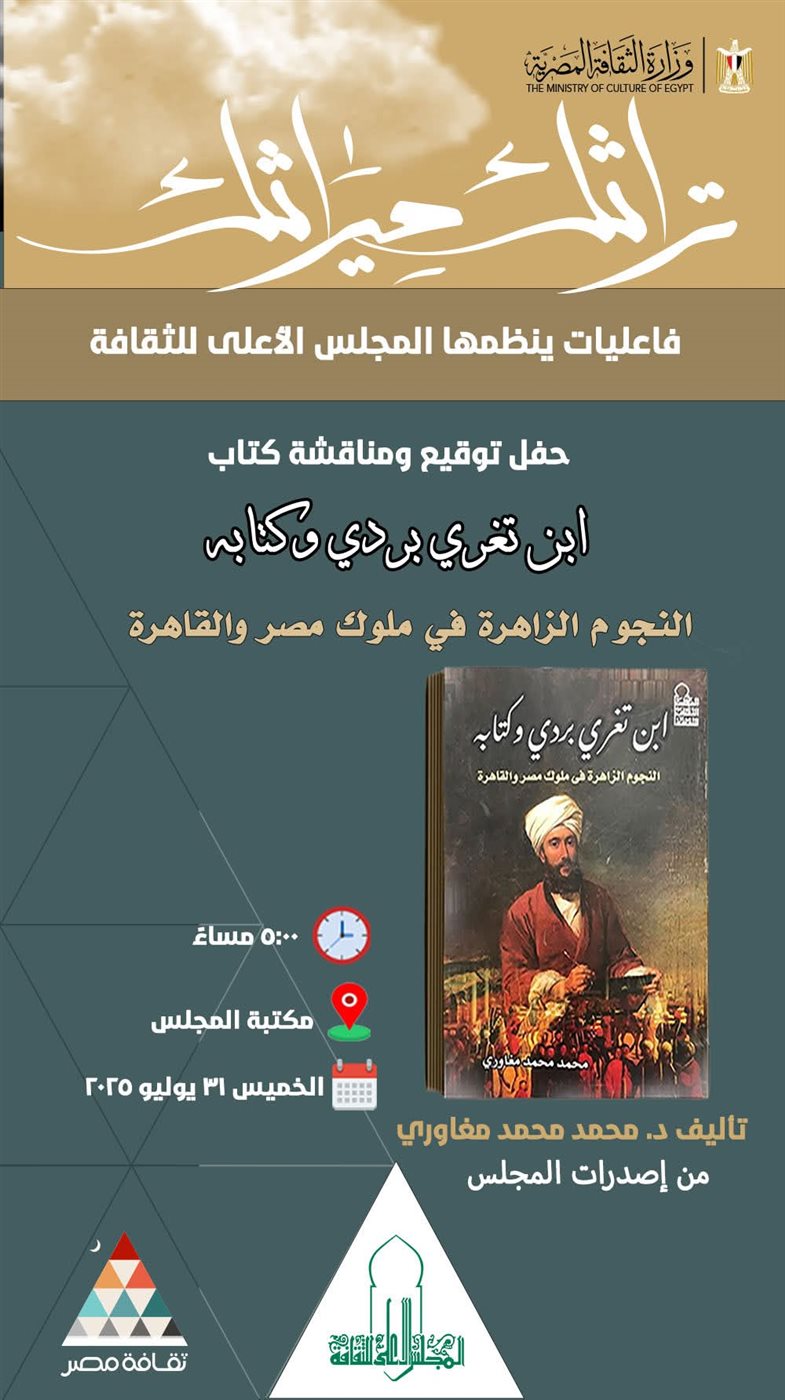 يقيم المجلس الأعلى للثقاقة حفل توقيع كتاب جديد معنون بـ"ابن تغري بردي وكتابه النجوم الزاهرة في ملوك مصر والقاهرة" الذي يعد من أحدث إصداراته ضمن مبادرة "تراثك مراثك"، وذلك في تمام الخامسة يوم الخميس الموافق 31 يوليو 2025؛ بمكتبة المجلس الأعلى للثقافة.