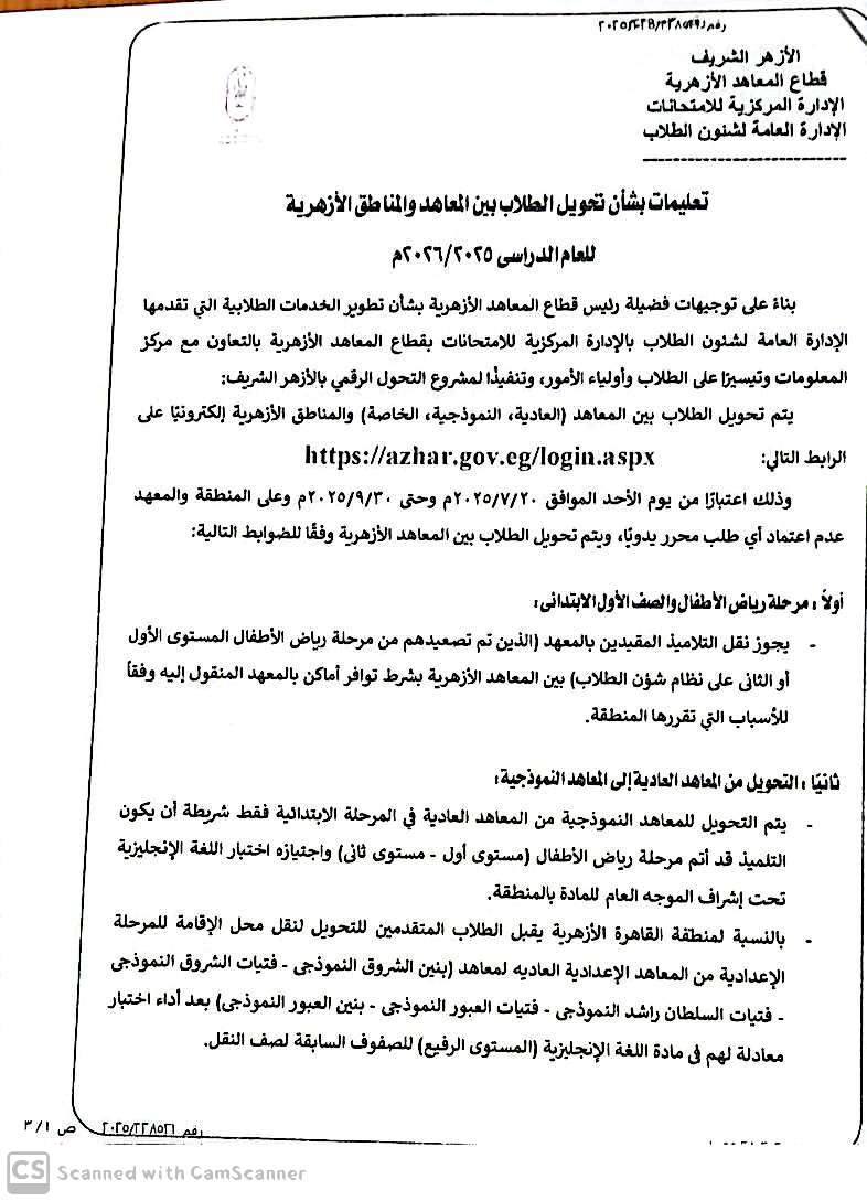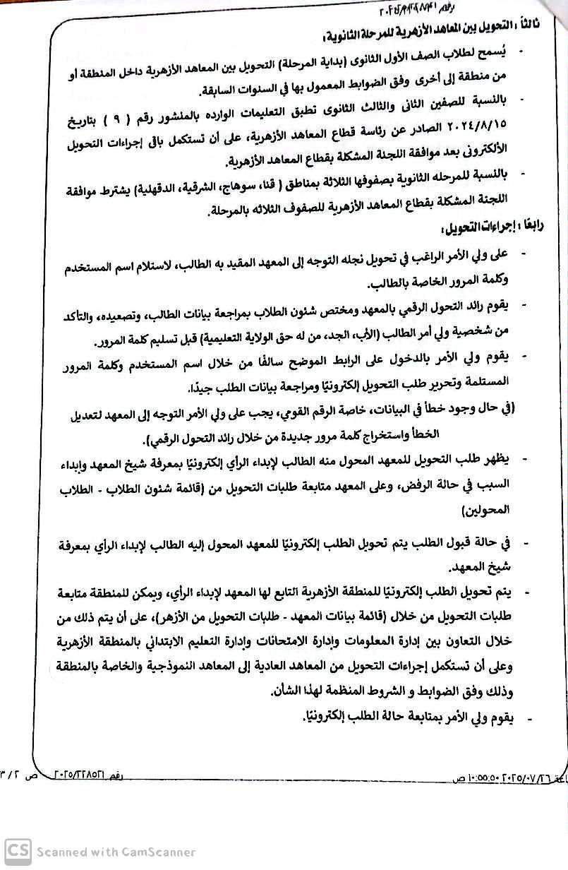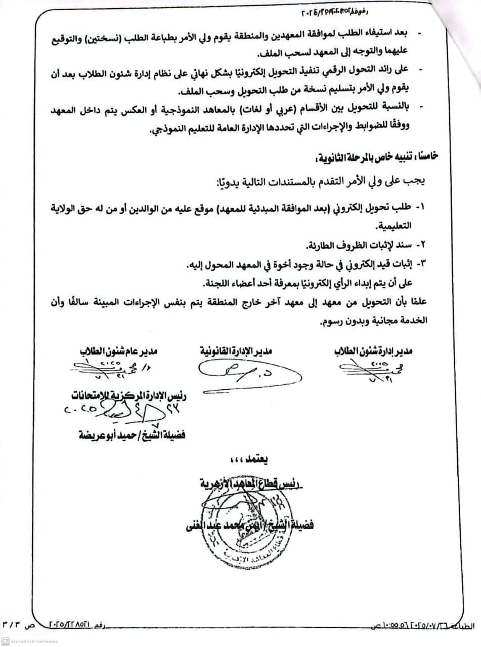 - الصفان الثاني والثالث الثانوي: يستوجب الحصول على موافقة لجنة التحويلات بقطاع المعاهد الأزهرية، لا سيّما في مناطق قنا، سوهاج، الشرقية، والدقهلية.