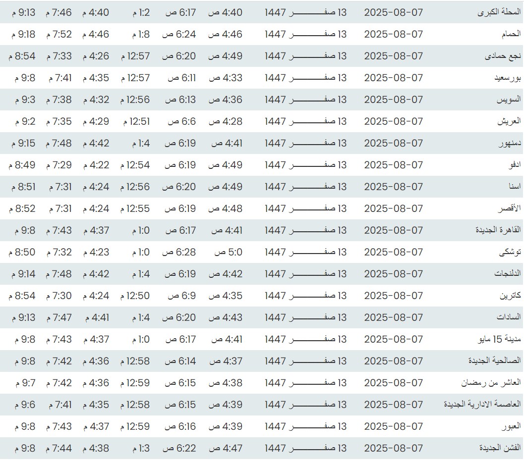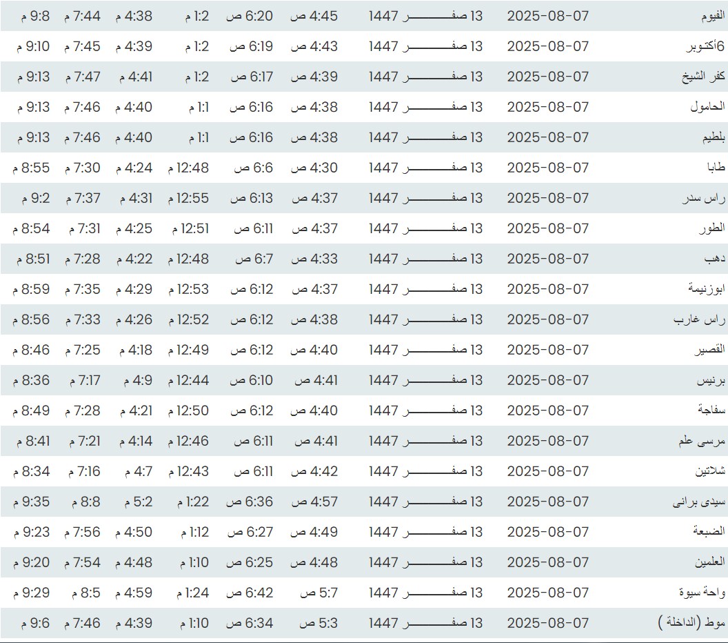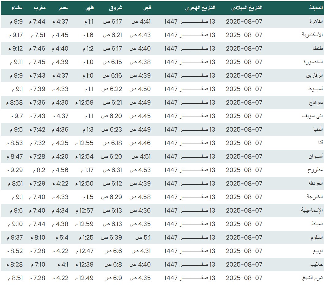 وفيما يلي مواقيت الصلاة، لعدد من مدن ومحافظات الجمهورية من واقع بيانات الهيئة العامة للمساحة