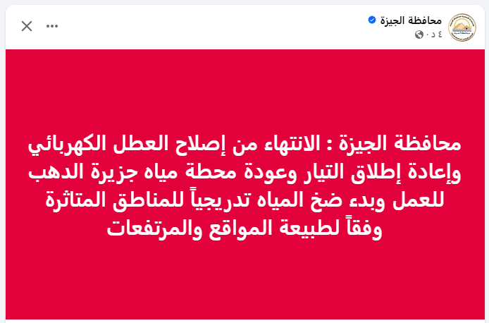 ونشرت محافظة الجيزة منشورا جاء فيه: "الانتهاء من إصلاح العطل الكهربائي وإعادة إطلاق التيار وعودة محطة مياه جزيرة الذهب للعمل وبدء ضخ المياه تدريجيًا للمناطق المتأثرة وفقًا لطبيعة المواقع والمرتفعات"، قبل أن تقوم بحذفه بعد دقائق قليلة وهو ما أثار حالة من الغضب والارتباك بين المواطنين بسبب استمرار انقطاع المياه والكهرباء في عدة مناطق منذ مساء أمس السبت.