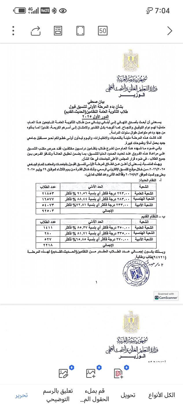 أعلنت وزارة التعليم العالي تنسيق المرحلة الأولى لطلاب الثانوية العامة النظامين (الحديث - القديم) الدور الأول 2025.
