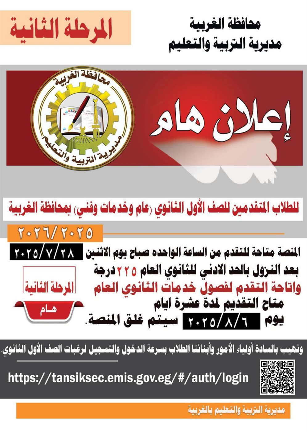 تعليم الغربية تُعلن إتاحة التقديم الإلكتروني للمرحلة الثانية من تنسيق القبول بالصف الأول الثانوي العام