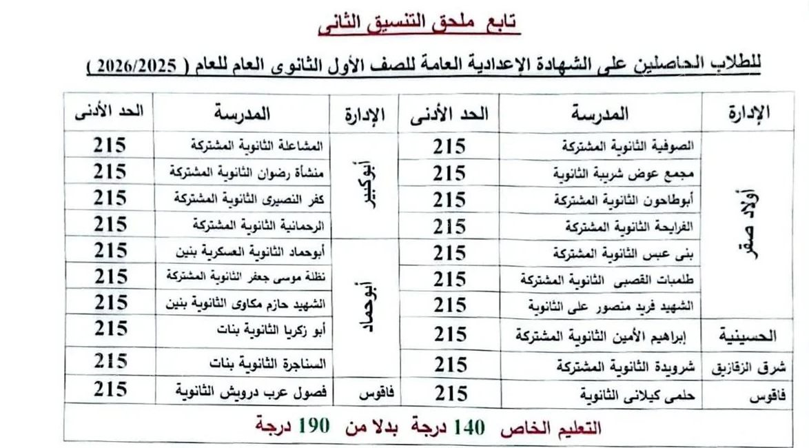 قرر المهندس حازم الأشموني محافظ الشرقية النزول بالحد الأدنى لتنسيق القبول بالصف الأول الثانوي العام للعام الدراسي 2025/ 2026 وذلك للناجحين في الشهادة الإعدادية العامة للعام الدراسي 2024 / 2025 بعدد من المدارس بنطاق المحافظة ليصبح 215 درجة بدلا من 220 درجة طبقًا للكشف المرفق.