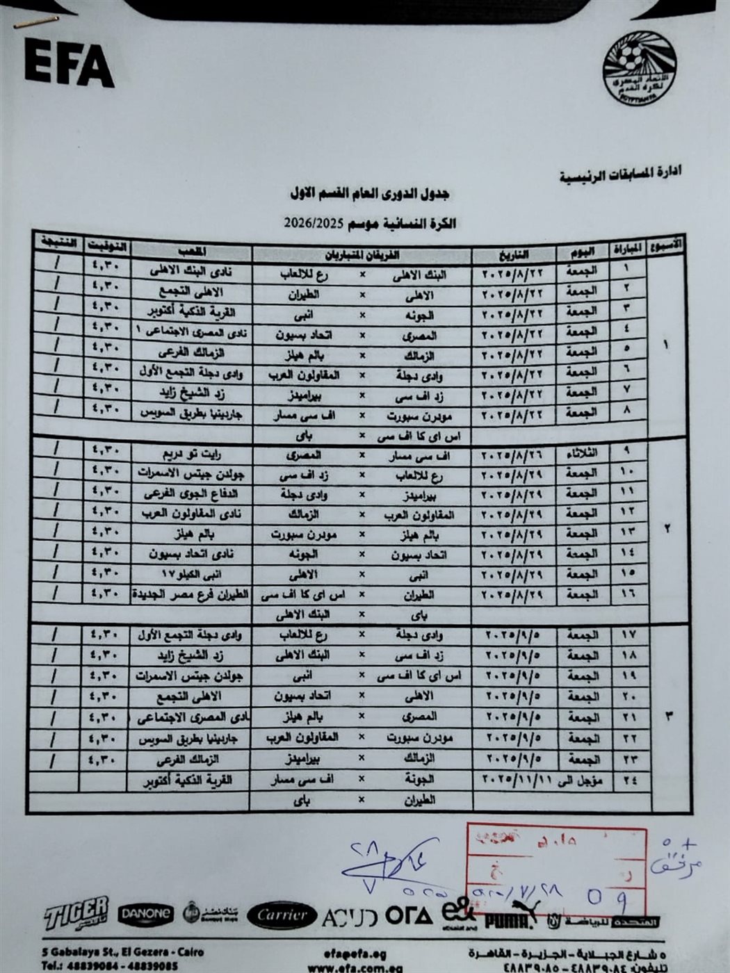 وكانت قرعة دورى الكرة النسائية أسفرت عن المواجهات التالية في الأسبوع الأول: