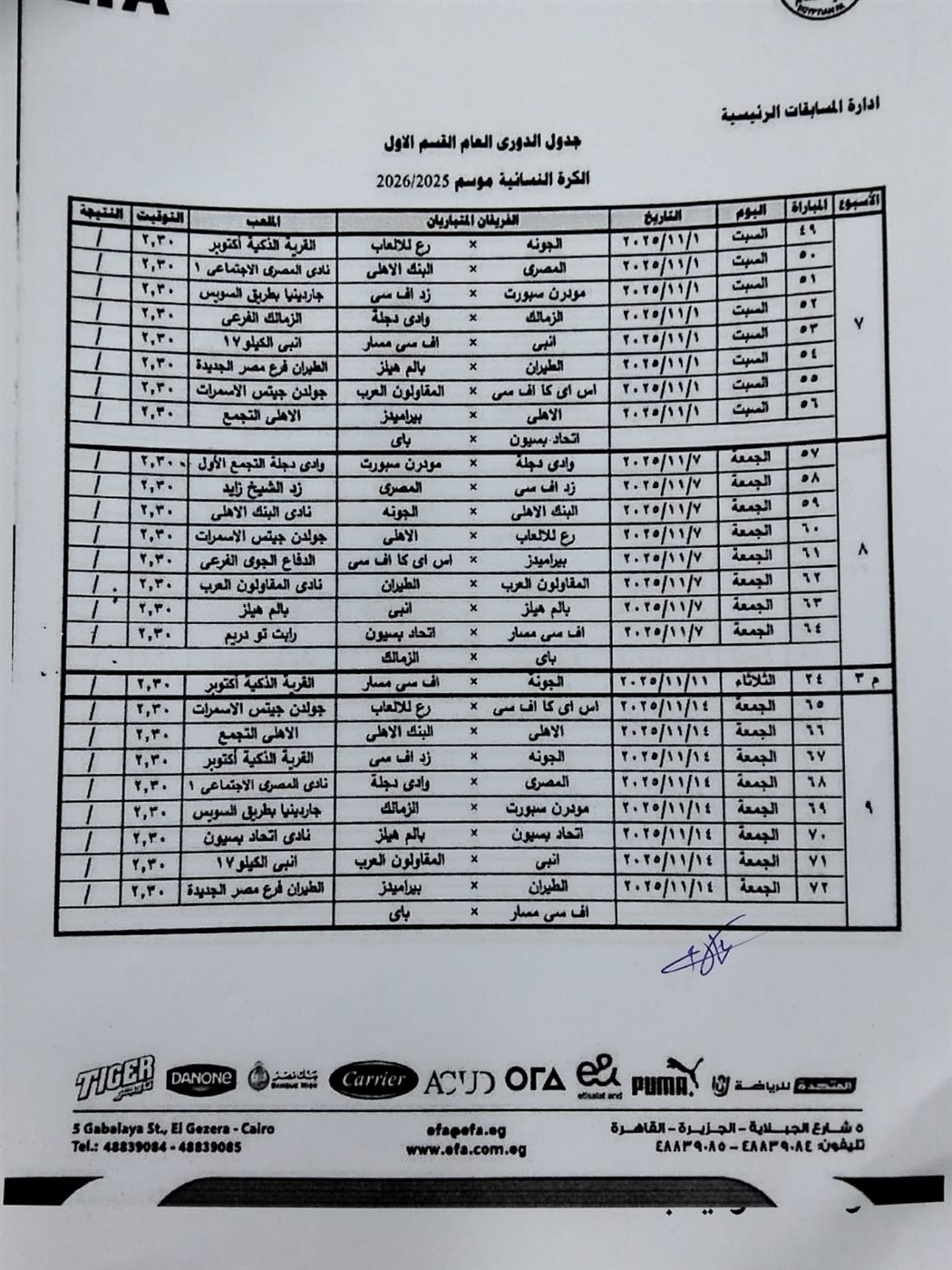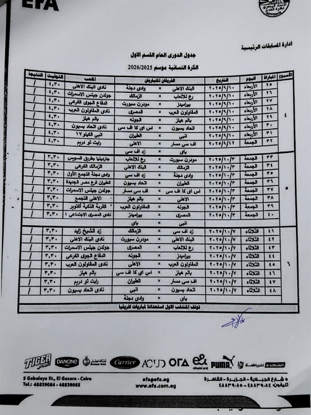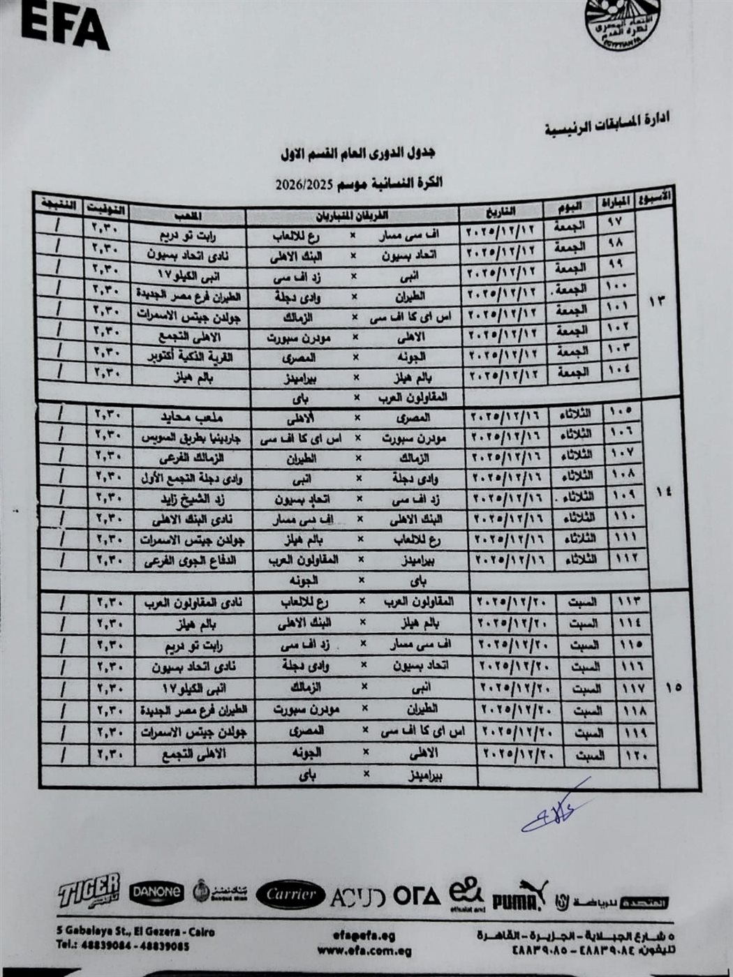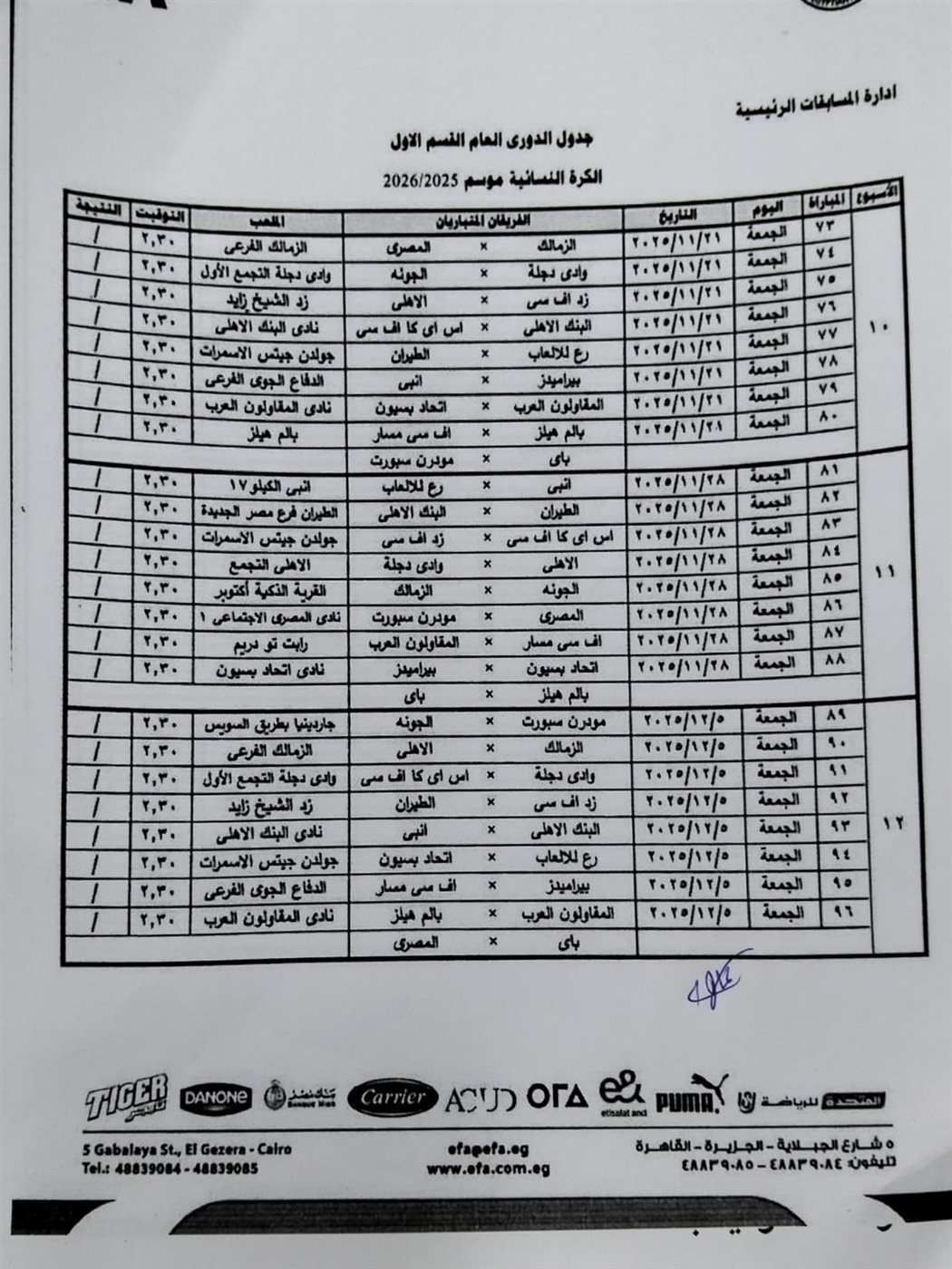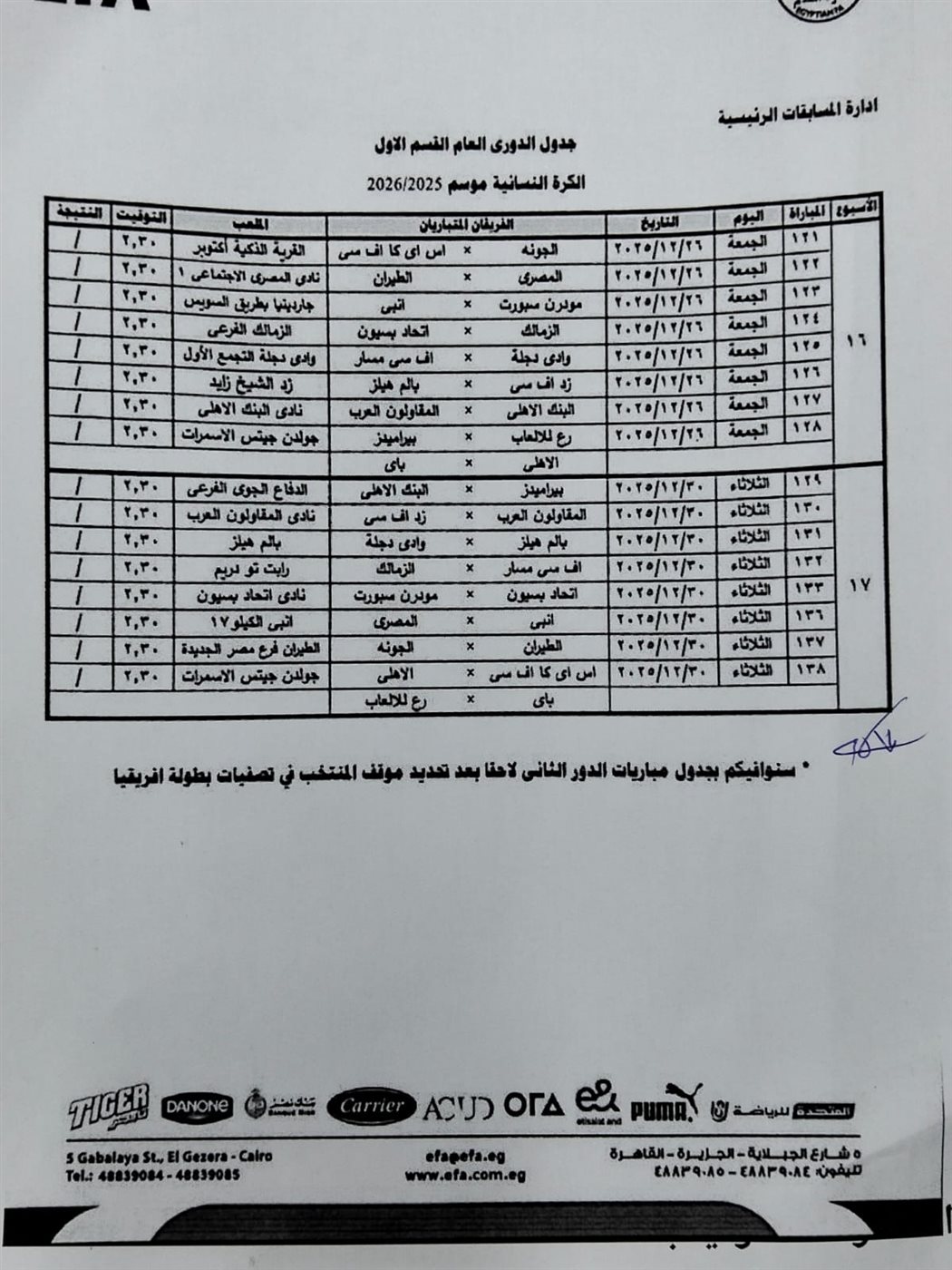 كما أسفرت القرعة عن مواجهة الزمالك والأهلي في الجولة الـ 12 والجولة 29 من عمر مسابقة الدوري الممتاز للكرة النسائية.