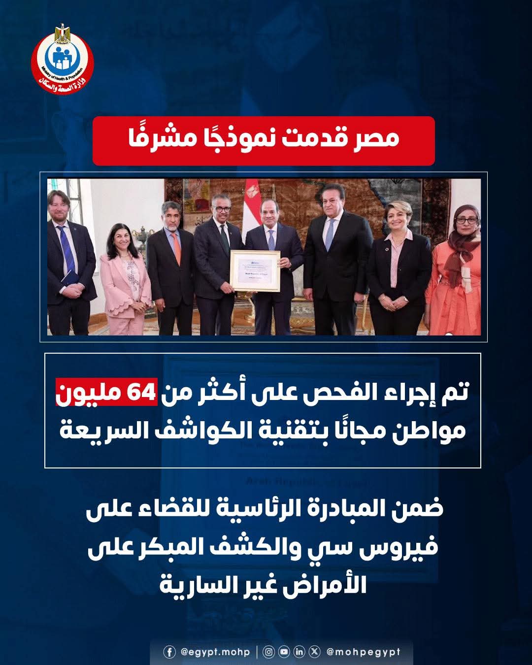 أكدت وزارة الصحة أن مصر قدمت نموذجًا مشرفًا في محاربة التهاب الكبد C حيث تم إجراء الفحص على أكثر من 64 مليون مواطن مجانًا بتقنية الكواشف السريعة، ضمن المبادرة الرئاسية للقضاء على فيروس سي والكشف المبكر على الأمراض غير السارية.