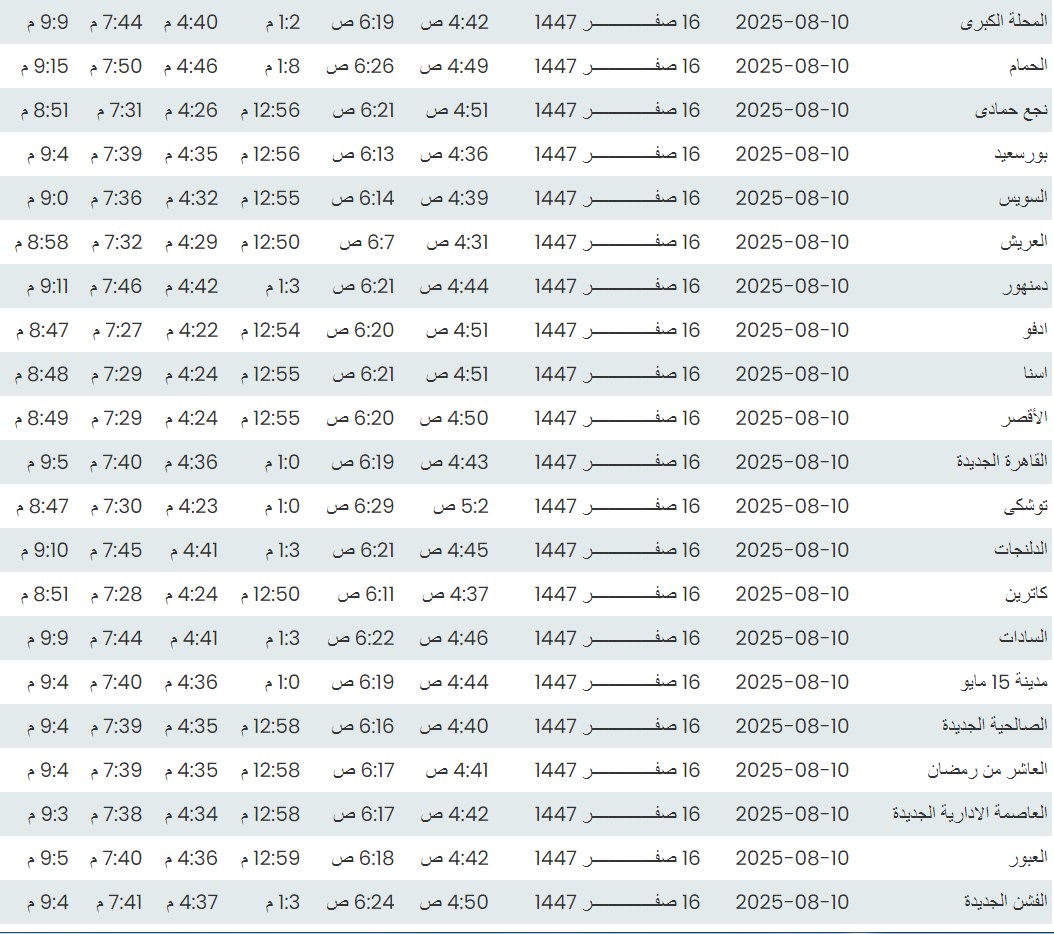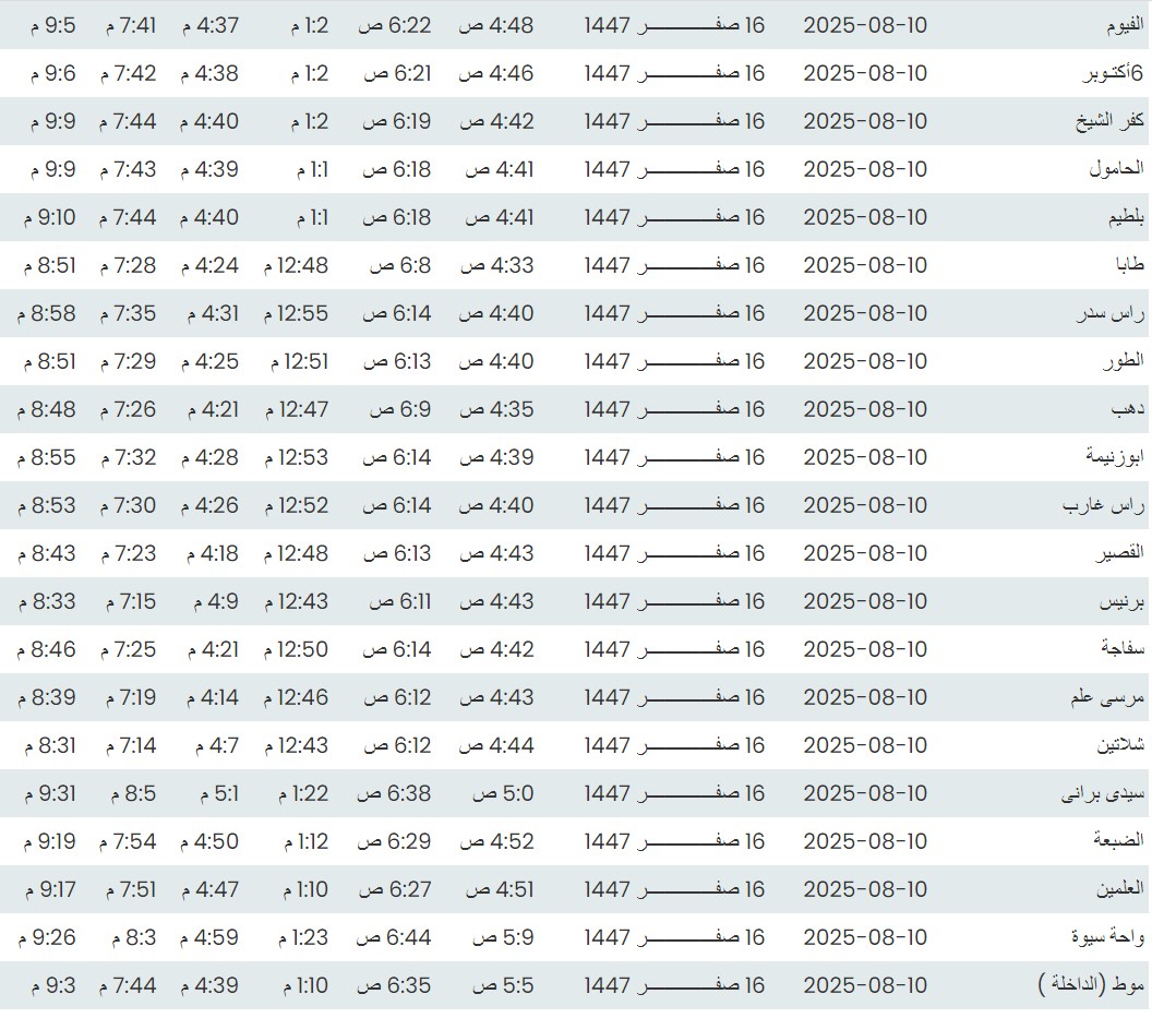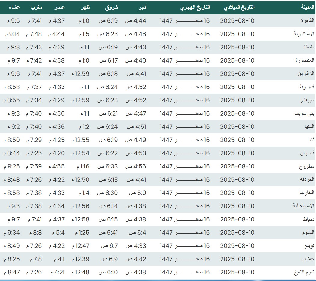 وفيما يلي مواقيت الصلاة، لعدد من مدن ومحافظات الجمهورية من واقع بيانات الهيئة العامة للمساحة