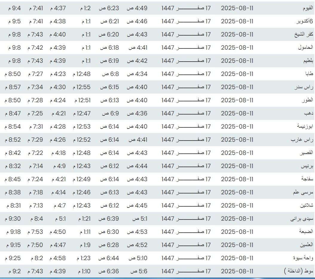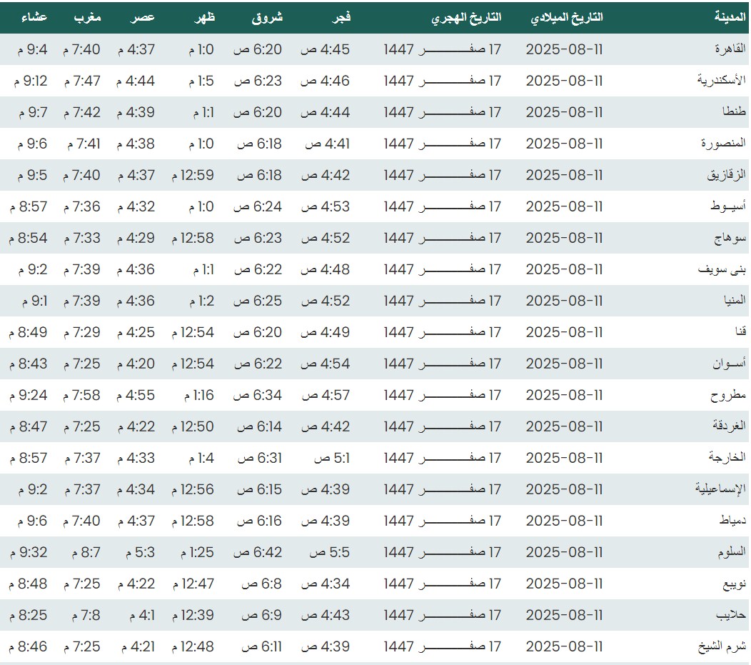 وفيما يلي مواقيت الصلاة، لعدد من مدن ومحافظات الجمهورية من واقع بيانات الهيئة العامة للمساحة