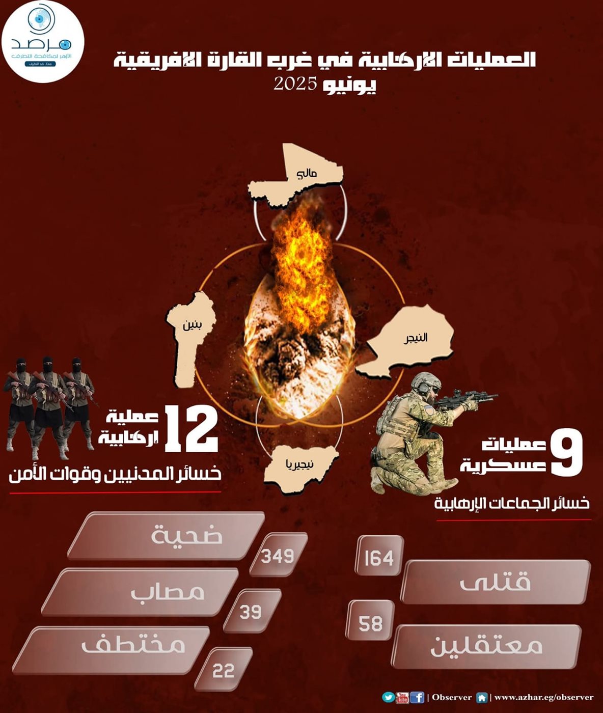 مرصد الأزهر: انخفاض عدد العمليات الإرهابية في غرب أفريقيا خلال يونيو