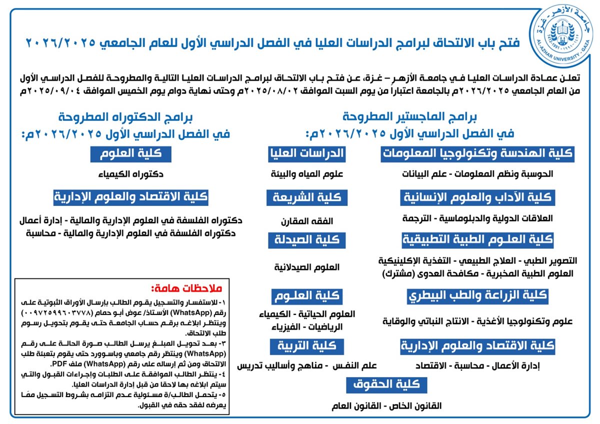 تستقبل عمادة الدراسات العليا في جامعة الأزهر – غزة، طلبات الالتحاق (مرفقة بالأوراق الثبوتية) (ملف PDF مجمع) للطالب/ة اعتبارًا من صباح يوم السبت الموافق 02/08/2025م وحتى نهاية دوام يوم الخميس الموافق 04/09/2025م عبر (WhatsApp) فقط.