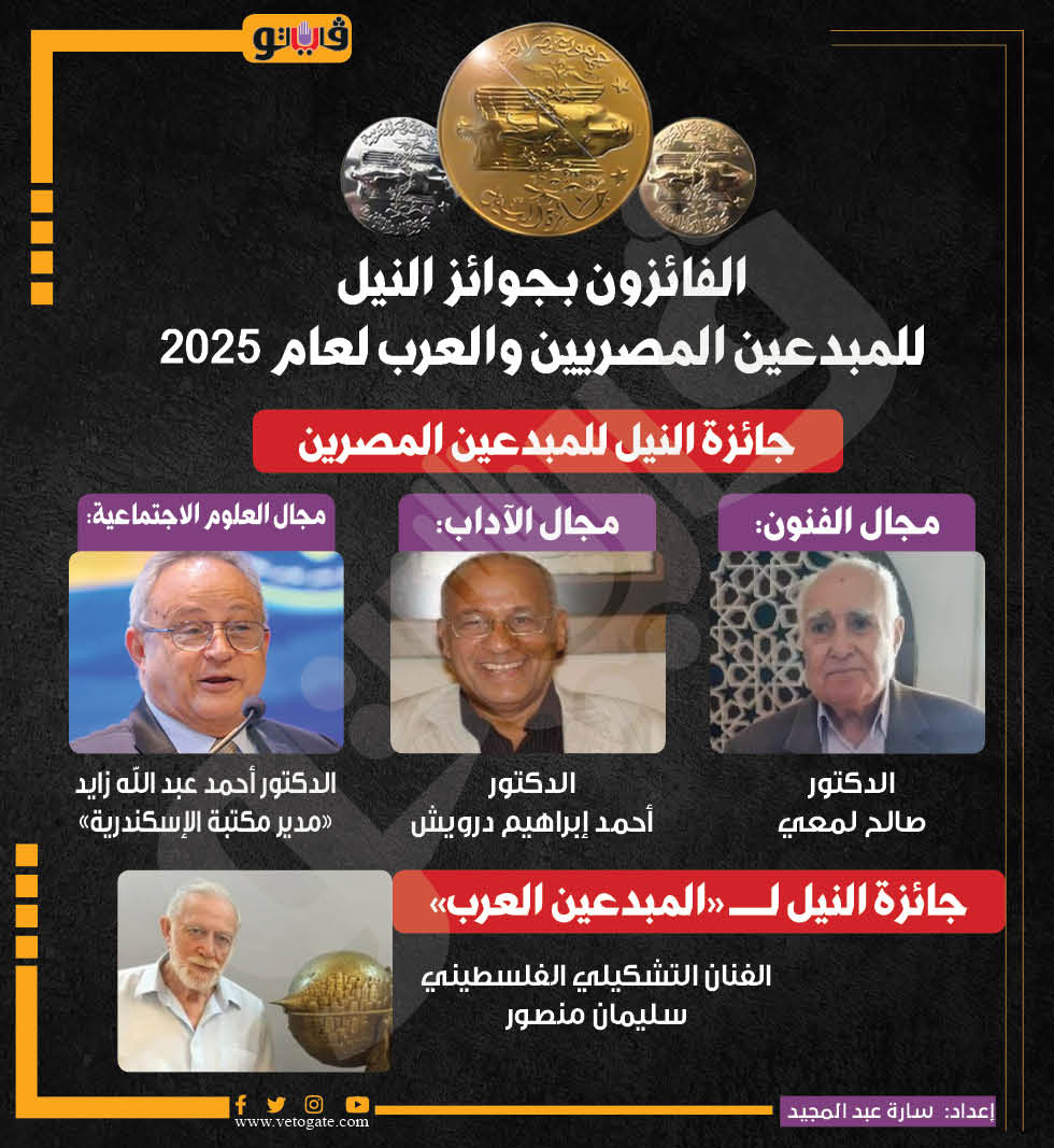 الفائزون بجوائز النيل للمبدعين المصريين والعرب لعام 2025 (انفوجراف)